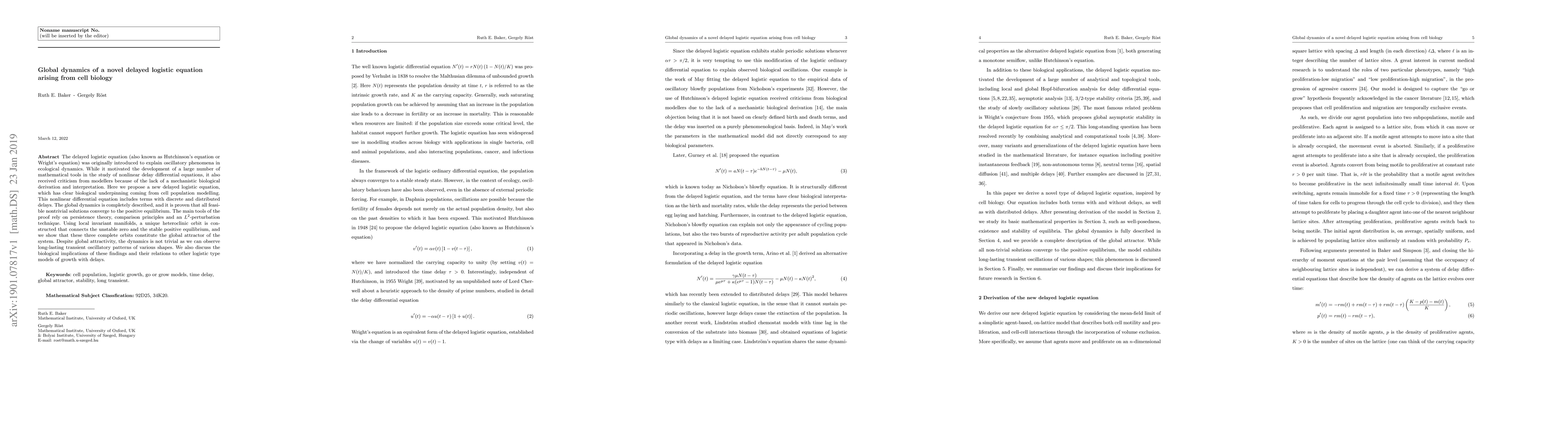 This paper proposes a novel delayed logistic equation derived from cell population modeling, demonstrating its global dynamics and proving that all nontrivial solutions converge to the positive equilibrium. The study employs persistence theory and $L^2$-perturbation techniques, revealing complex oscillatory transients despite global attractivity.