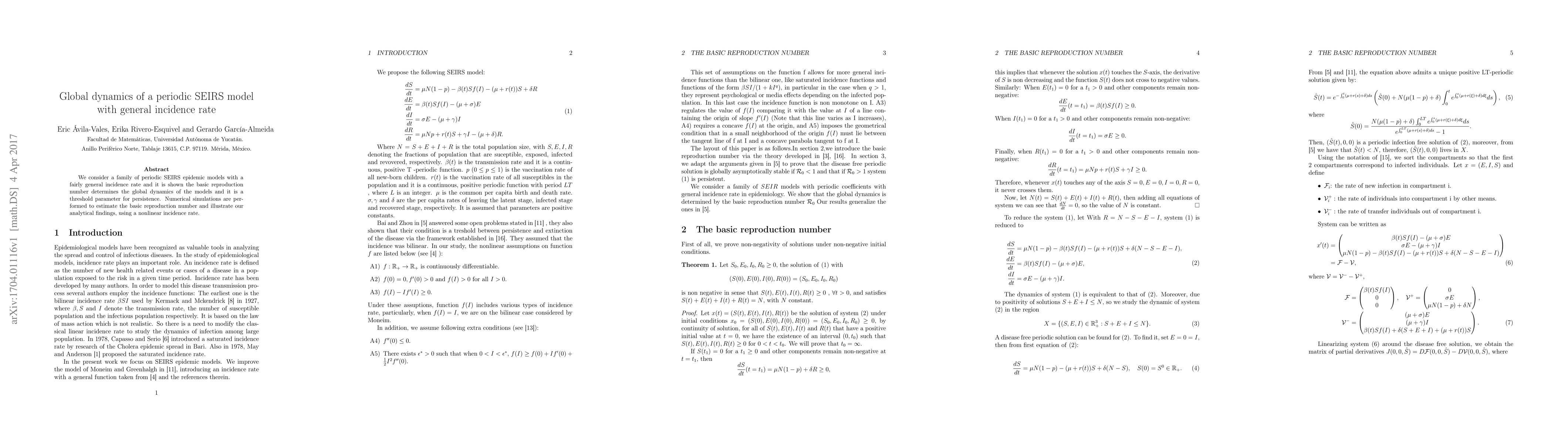 This paper investigates periodic SEIRS epidemic models with a general incidence rate, demonstrating that the basic reproduction number determines the global dynamics and acts as a threshold for disease persistence. Numerical simulations are used to estimate this number and validate the analytical results.