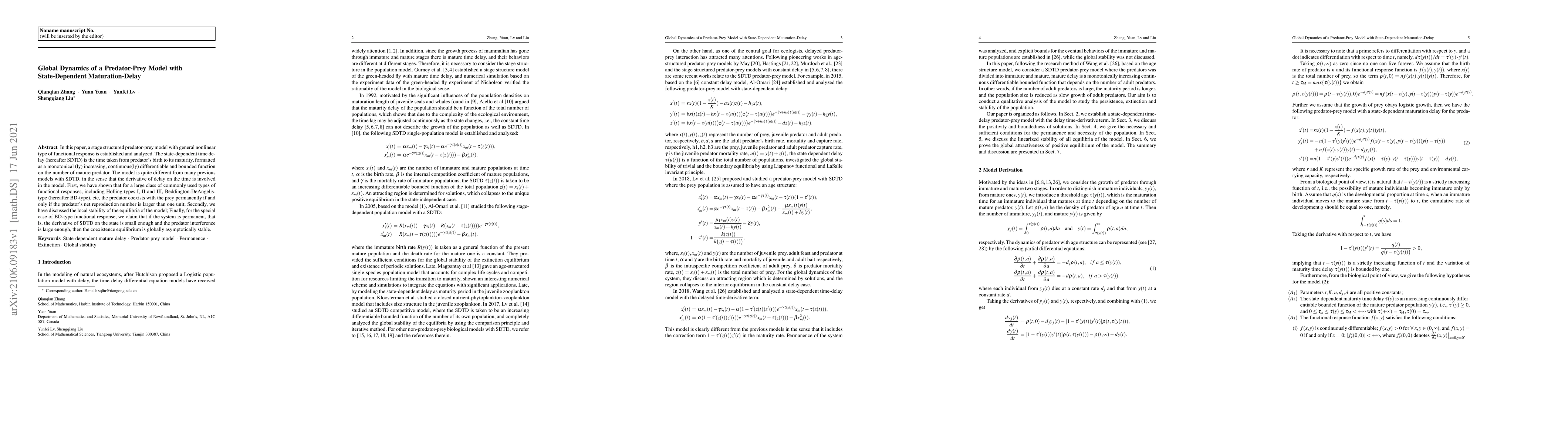 This paper establishes and analyzes a stage-structured predator-prey model with state-dependent maturation delay, showing that predator-prey coexistence occurs if the predator's net reproduction number exceeds one, and proves global stability for the BD-type functional response under certain conditions.