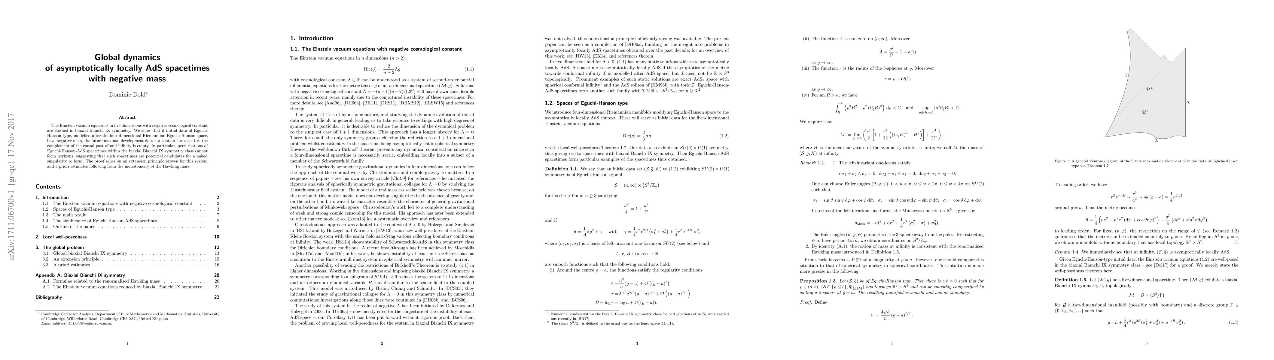 This paper investigates the dynamics of asymptotically locally AdS spacetimes in five dimensions with a negative cosmological constant, focusing on biaxial Bianchi IX symmetry. It demonstrates that initial data modeled after Eguchi-Hanson spaces with negative mass lead to future developments without horizons, indicating potential naked singularity formation.