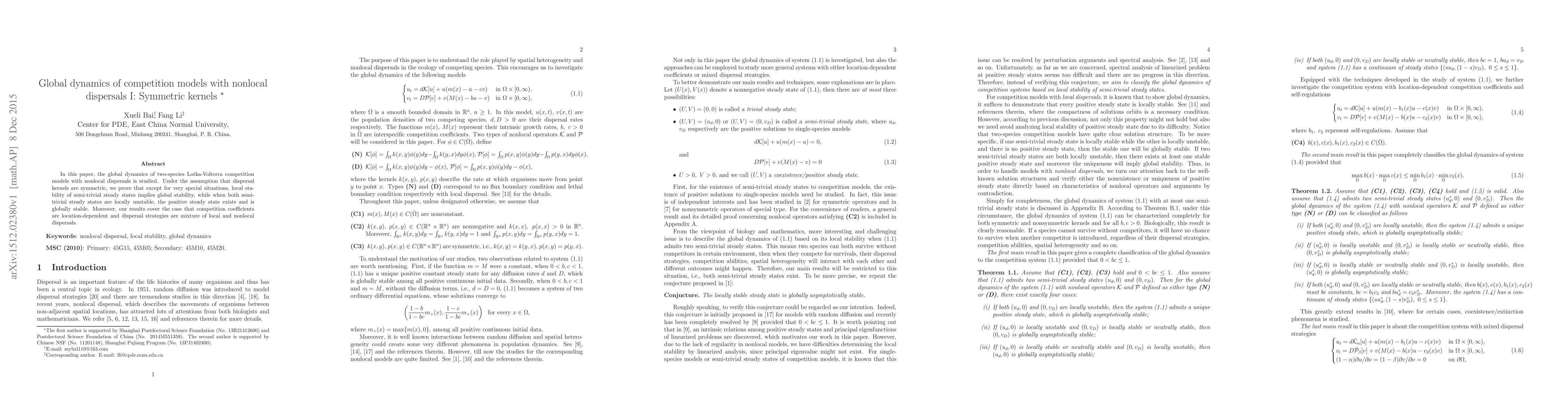 This paper investigates the global dynamics of two-species competition models with nonlocal dispersals, proving that local stability of semi-trivial steady states generally implies global stability. It also shows that when both semi-trivial steady states are unstable, a positive steady state exists and is globally stable, even with location-dependent competition coefficients.