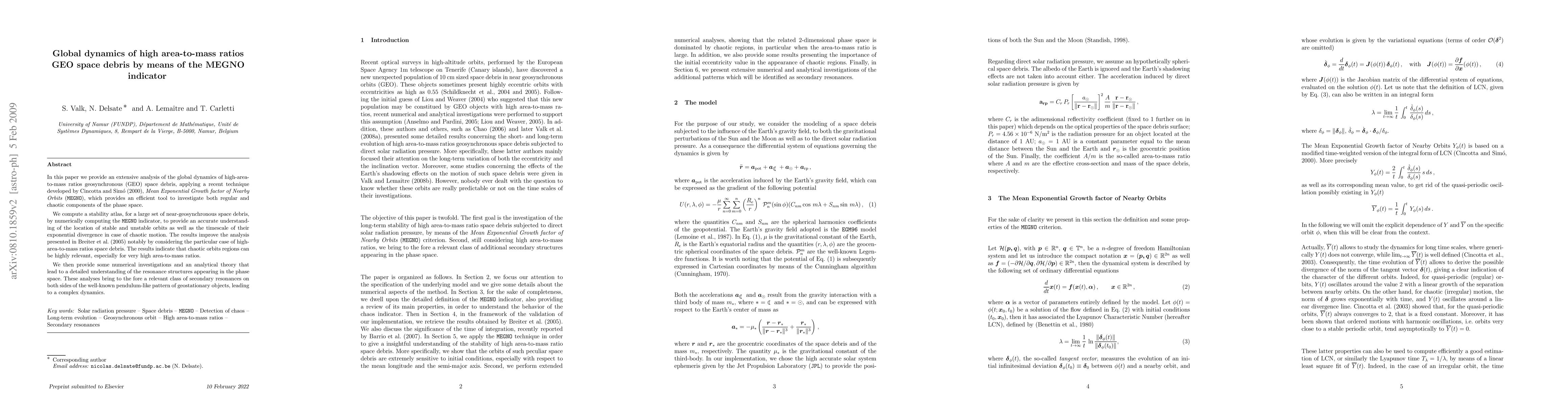 This paper analyzes the global dynamics of high-area-to-mass ratios GEO space debris using the MEGNO indicator to explore phase space stability. The study reveals significant chaotic regions and complex resonance structures, enhancing understanding of debris dynamics.