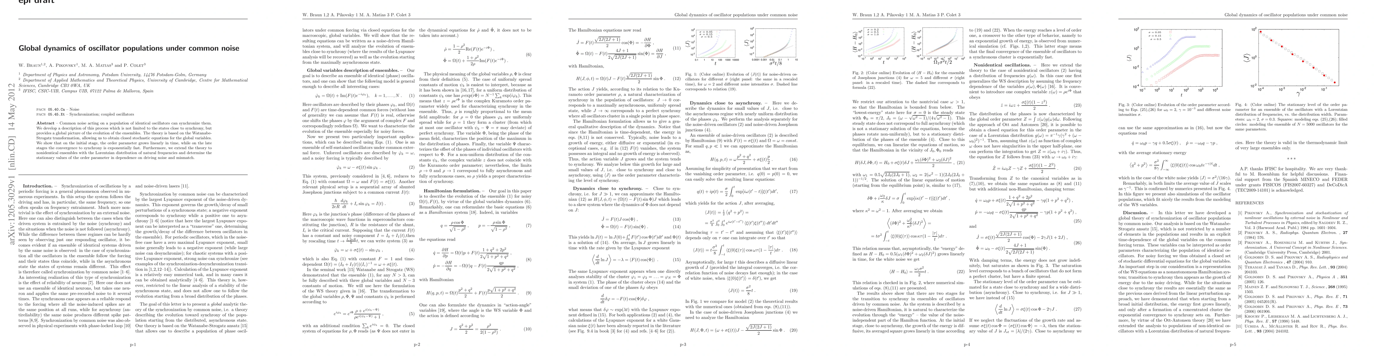 This paper develops a global theory for the synchronization of oscillator populations under common noise, using the Watanabe-Strogatz transformation to derive stochastic equations. It finds linear growth of the order parameter initially, followed by exponential convergence to synchrony, and extends the model to nonidentical oscillators with Lorentzian frequency distributions.