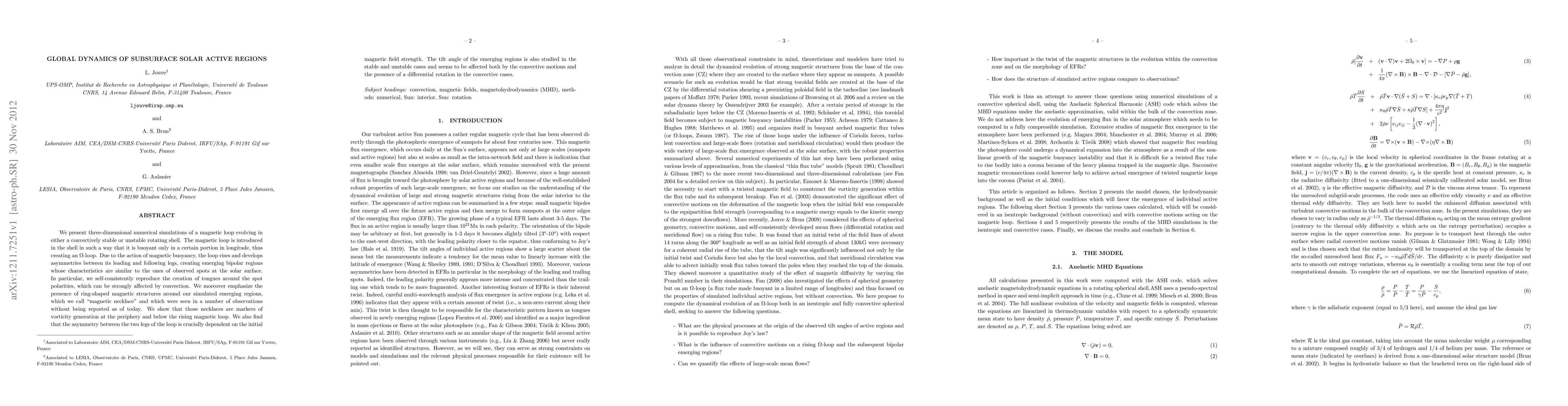 We present three-dimensional numerical simulations of a magnetic loop evolving in either a convectively stable or unstable rotating shell. The magnetic loop is introduced in the shell in such a way that it is buoyant only in a certain portion in longitude, thus creating an \Omega-loop. Due to the action of magnetic buoyancy, the loop rises and develops asymmetries between its leading and following legs, creating emerging bipolar regions whose characteristics are similar to the ones of observed spots at the solar surface. In particular, we self-consistently reproduce the creation of tongues around the spot polarities, which can be strongly affected by convection. We moreover emphasize the presence of ring-shaped magnetic structures around our simulated emerging regions, which we call "magnetic necklace" and which were seen in a number of observations without being reported as of today. We show that those necklaces are markers of vorticity generation at the periphery and below the rising magnetic loop. We also find that the asymmetry between the two legs of the loop is crucially dependent on the initial magnetic field strength. The tilt angle of the emerging regions is also studied in the stable and unstable cases and seems to be affected both by the convective motions and the presence of a differential rotation in the convective cases.