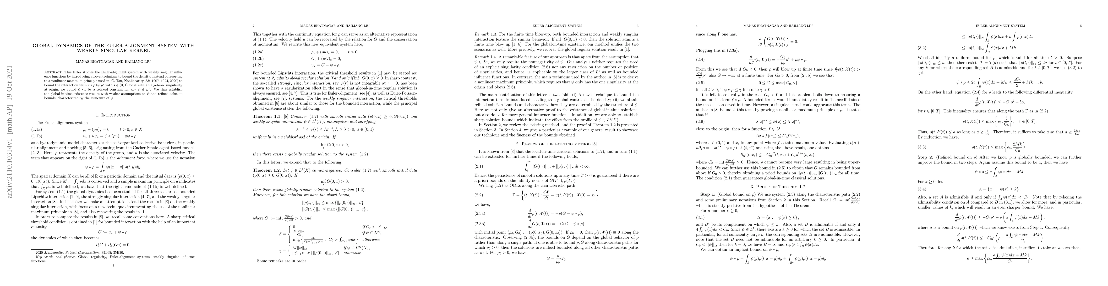 The paper studies the Euler-alignment system with weakly singular influence functions, establishing global-in-time existence results with weaker assumptions on the influence function and refined solution bounds.