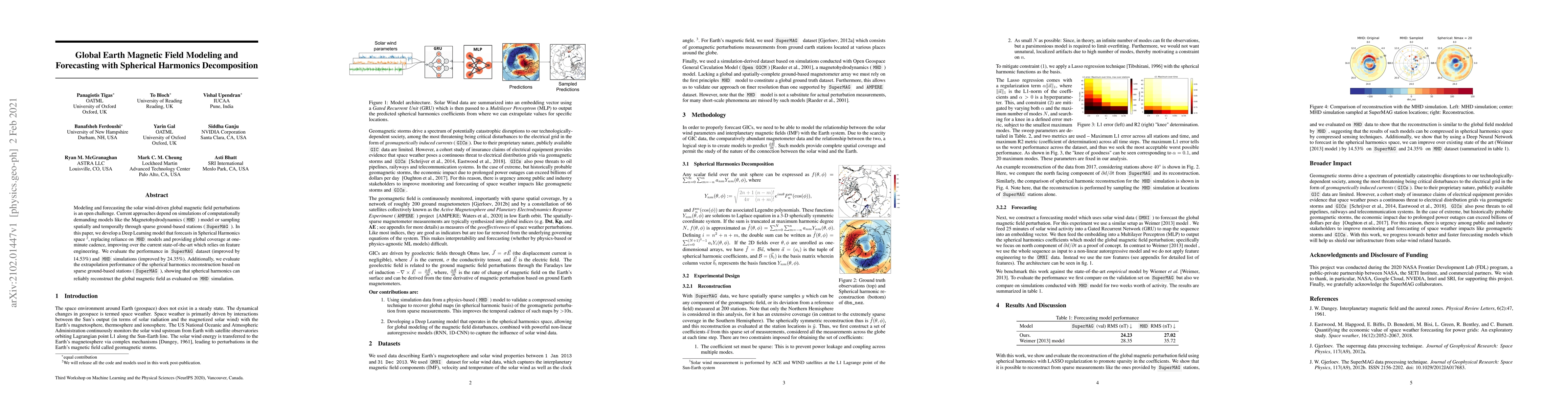 This paper introduces a Deep Learning model for forecasting solar wind-driven global magnetic field perturbations using Spherical Harmonics decomposition, achieving improved accuracy over traditional methods and MHD simulations, and demonstrating reliable extrapolation from sparse ground-based data.