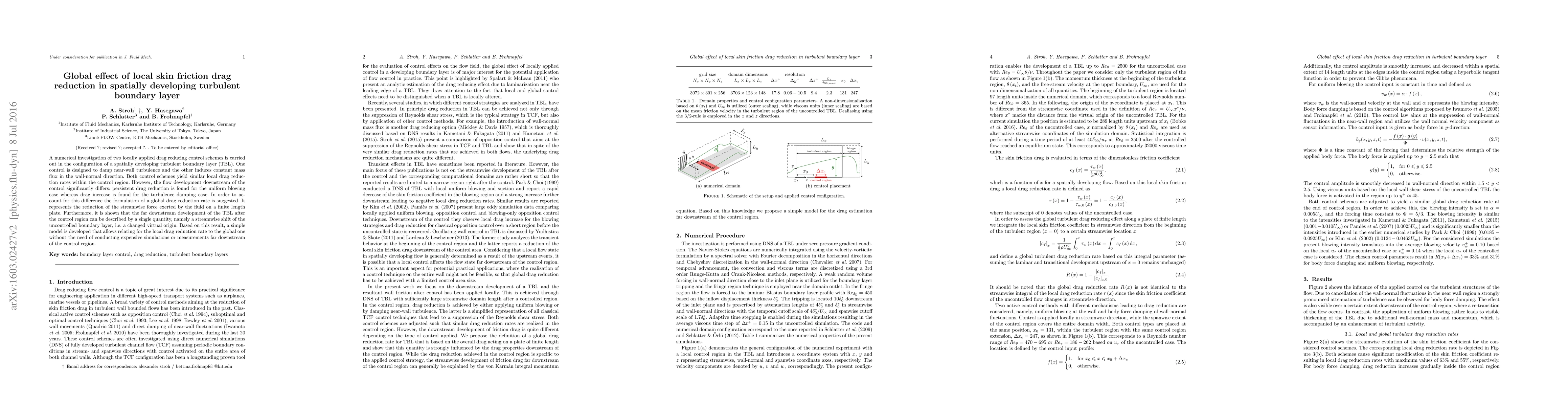 A numerical investigation of two locally applied drag reducing control schemes is carried out in the configuration of a spatially developing turbulent boundary layer (TBL). One control is designed to damp near-wall turbulence and the other induces constant mass flux in the wall-normal direction. Both control schemes yield similar local drag reduction rates within the control region. However, the flow development downstream of the control significantly differs: persistent drag reduction is found for the uniform blowing case whereas drag increase is found for the turbulence damping case. In order to account for this difference the formulation of a global drag reduction rate is suggested. It represents the reduction of the streamwise force exerted by the fluid on a finite length plate. Furthermore, it is shown that the far downstream development of the TBL after the control region can be described by a single quantity, namely a streamwise shift of the uncontrolled boundary layer, i.e. a changed virtual origin. Based on this result, a simple model is developed that allows relating for the local drag reduction rate to the global one without the need of conducting expensive simulations or measurements far downstream of the control region.