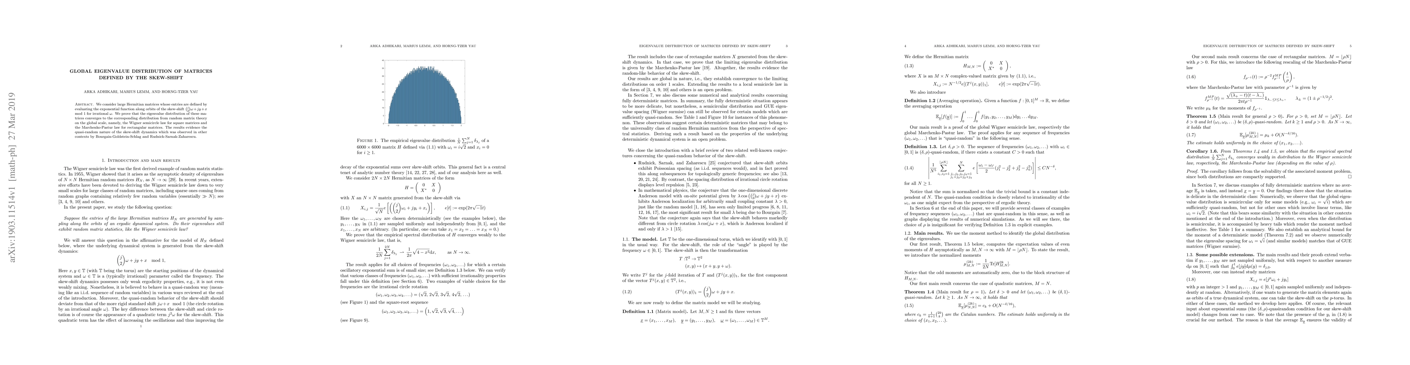 We consider large Hermitian matrices whose entries are defined by evaluating the exponential function along orbits of the skew-shift $\binom{j}{2} \omega+jy+x \mod 1$ for irrational $\omega$. We prove that the eigenvalue distribution of these matrices converges to the corresponding distribution from random matrix theory on the global scale, namely, the Wigner semicircle law for square matrices and the Marchenko-Pastur law for rectangular matrices. The results evidence the quasi-random nature of the skew-shift dynamics which was observed in other contexts by Bourgain-Goldstein-Schlag and Rudnick-Sarnak-Zaharescu.