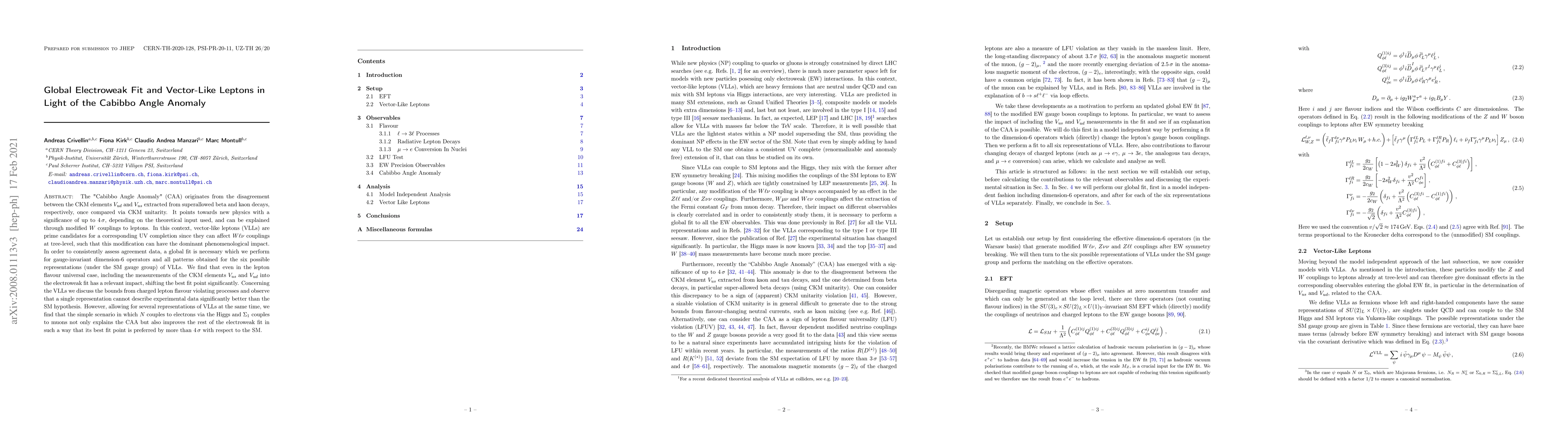 This paper investigates the "Cabibbo Angle Anomaly" (CAA) through a global electroweak fit, exploring vector-like leptons (VLLs) as potential explanations. It finds that incorporating CKM elements into the fit significantly shifts the best fit point, and while individual VLL representations do not outperform the Standard Model, a combined scenario involving multiple VLLs can explain the CAA and improve the electroweak fit by more than $4\,\sigma$.