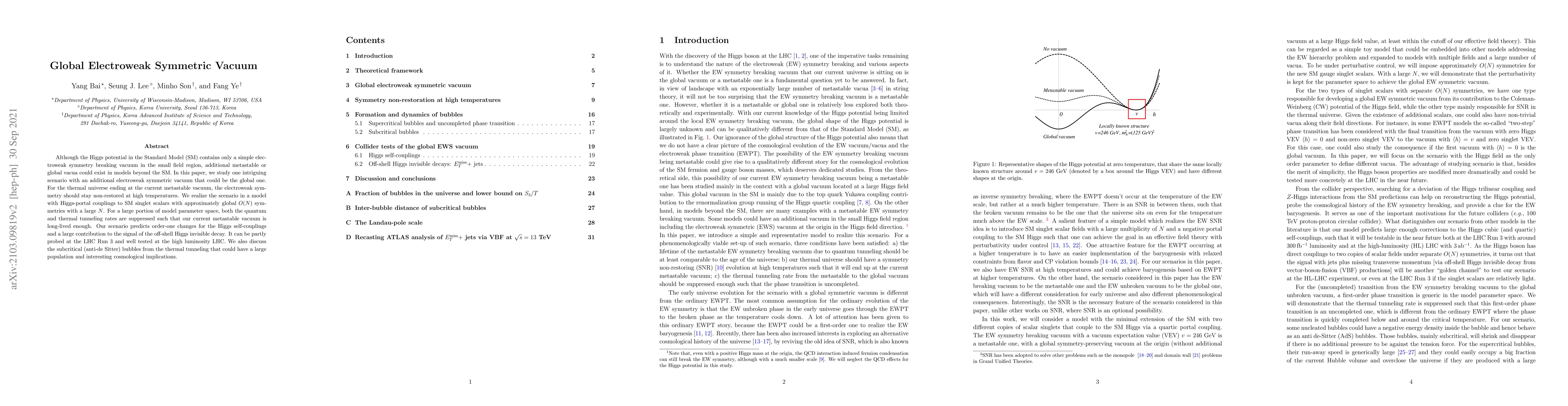 Although the Higgs potential in the Standard Model (SM) contains only a simple electroweak symmetry breaking vacuum in the small field region, additional metastable or global vacua could exist in models beyond the SM. In this paper, we study one intriguing scenario with an additional electroweak symmetric vacuum that could be the global one. For the thermal universe ending at the current metastable vacuum, the electroweak symmetry should stay non-restored at high temperatures. We realize the scenario in a model with Higgs-portal couplings to SM singlet scalars with approximately global O(N) symmetries with a large N. For a large portion of model parameter space, both the quantum and thermal tunneling rates are suppressed such that our current metastable vacuum is long-lived enough. Our scenario predicts order-one changes for the Higgs self-couplings and a large contribution to the signal of the off-shell Higgs invisible decay. It can be partly probed at the LHC Run 3 and well tested at the high luminosity LHC. We also discuss the subcritical (anti-de Sitter) bubbles from the thermal tunneling that could have a large population and interesting cosmological implications.