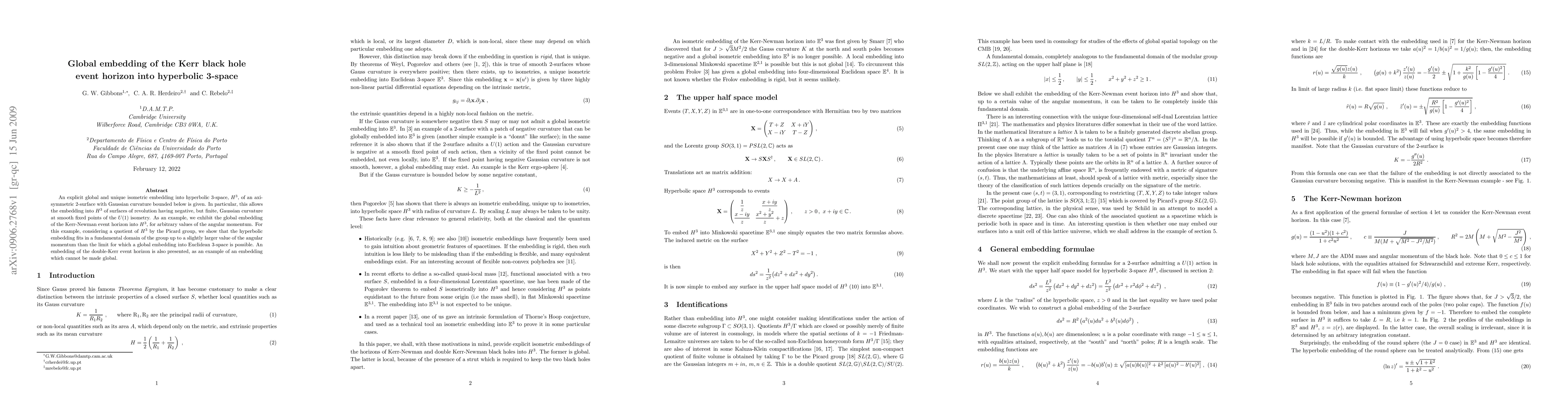 An explicit global and unique isometric embedding into hyperbolic 3-space, H^3, of an axi-symmetric 2-surface with Gaussian curvature bounded below is given. In particular, this allows the embedding into H^3 of surfaces of revolution having negative, but finite, Gaussian curvature at smooth fixed points of the U(1) isometry. As an example, we exhibit the global embedding of the Kerr-Newman event horizon into H^3, for arbitrary values of the angular momentum. For this example, considering a quotient of H^3 by the Picard group, we show that the hyperbolic embedding fits in a fundamental domain of the group up to a slightly larger value of the angular momentum than the limit for which a global embedding into Euclidean 3-space is possible. An embedding of the double-Kerr event horizon is also presented, as an example of an embedding which cannot be made global.