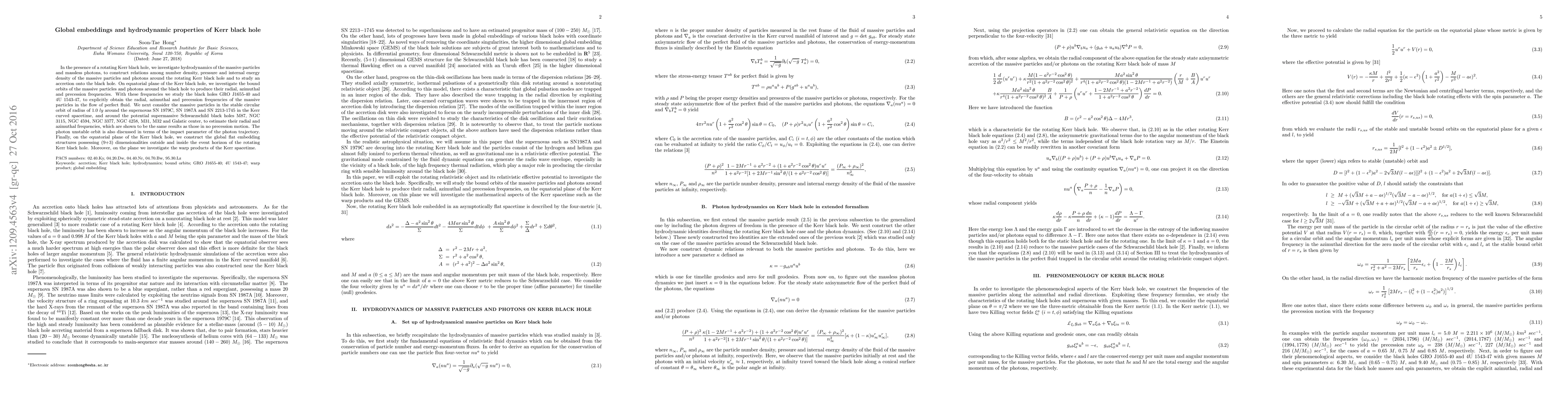 In the presence of a rotating Kerr black hole, we investigate hydrodynamics of the massive particles and massless photons, to construct relations among number density, pressure and internal energy density of the massive particles and photons around the rotating Kerr black hole and to study an accretion onto the black hole. On equatorial plane of the Kerr black hole, we investigate the bound orbits of the massive particles and photons around the black hole to produce their radial, azimuthal and precession frequencies. With these frequencies we study the black holes GRO~J1655-40 and 4U~1543-47, to explicitly obtain the radial, azimuthal and precession frequencies of the massive particles in the flow of perfect fluid. We next consider the massive particles in the stable circular orbit of radius of $1.0~ly$ around the supernovas SN 1979C, SN 1987A and SN 2213-1745 in the Kerr curved spacetime, and around the potential supermassive Schwarzschild black holes M87, NGC 3115, NGC 4594, NGC 3377, NGC 4258, M31, M32 and Galatic center, to estimate their radial and azimuthal frequencies, which are shown to be the same results as those in no precession motion. The photon unstable orbit is also discussed in terms of the impact parameter of the photon trajectory. Finally, on the equatorial plane of the Kerr black hole, we construct the global flat embedding structures possessing (9+3) dimensionalities outside and inside the event horizon of the rotating Kerr black hole. Moreover, on the plane we investigate the warp products of the Kerr spacetime.