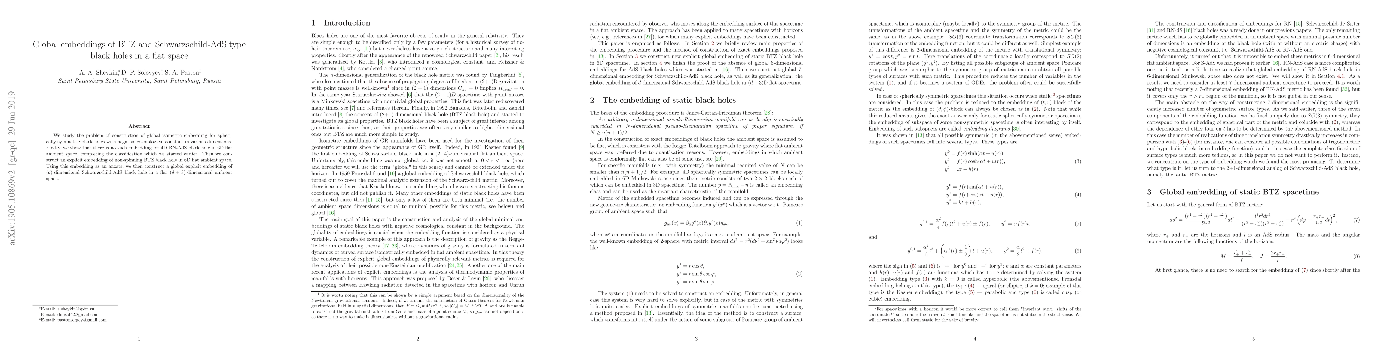 We study the problem of construction of global isometric embedding for spherically symmetric black holes with negative cosmological constant in various dimensions. Firstly, we show that there is no such embedding for 4D RN-AdS black hole in 6D flat ambient space, completing the classification which we started earlier. Then we construct an explicit embedding of non-spinning BTZ black hole in 6D flat ambient space. Using this embedding as an anzats, we then construct a global explicit embedding of (d)-dimensional Schwarzschild-AdS black hole in a flat (d+3)-dimensional ambient space.