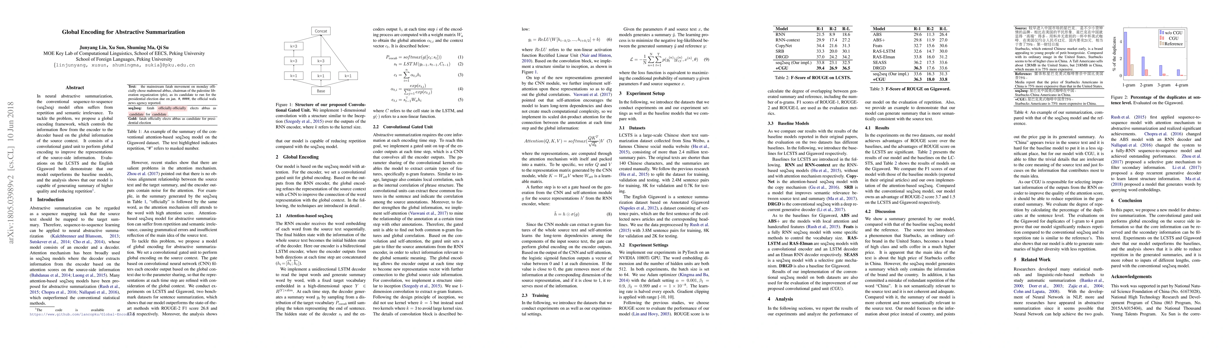 This paper proposes a global encoding framework for neural abstractive summarization to address repetition and semantic irrelevance. The framework uses a convolutional gated unit for global encoding to enhance source-side information representations, leading to improved summarization performance and reduced repetition, as demonstrated on LCSTS and English Gigaword datasets.