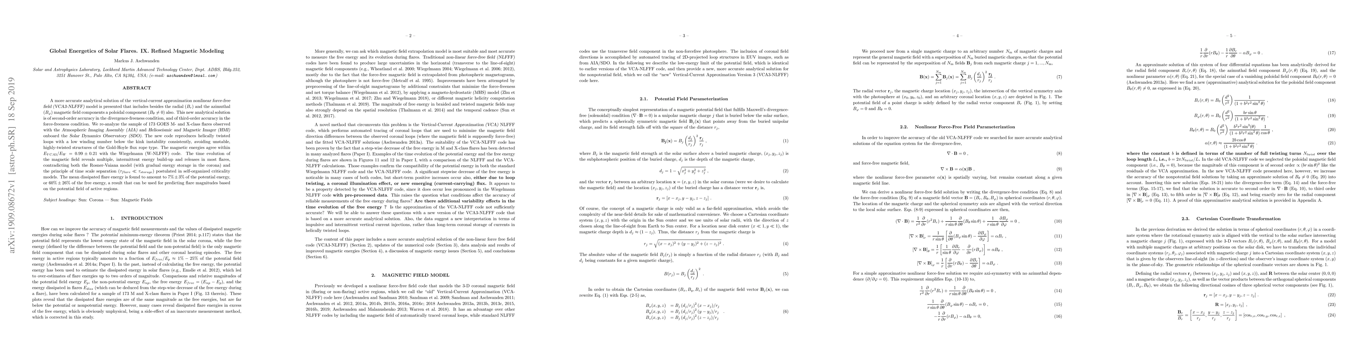 A more accurate analytical solution of the {\sl vertical-current approximation nonlinear force-free field (VCA3-NLFFF)} model is presented that includes besides the radial $(B_r)$ and the azimuthal $(B_\varphi)$ magnetic field components a poloidal component $(B_{\theta} \neq 0)$ also. This new analytical solution is of second-order accuracy in the divergence-freeness condition, and of third-order accuracy in the force-freeness condition. We re-analyze the sample of 173 GOES M- and X-class flares observed with the {\sl Atmospheric Imaging Assembly (AIA)} and {\sl Helioseismic and Magnetic Imager (HMI)} onboard the {\sl Solar Dynamics Observatory (SDO)}. The new code reproduces helically twisted loops with a low winding number below the kink instability consistently, avoiding unstable, highly-twisted structures of the Gold-Hoyle flux rope type. The magnetic energies agree within $E_{VCA3}/E_W=0.99\pm0.21$ with the Wiegelmann (W-NLFFF) code. The time evolution of the magnetic field reveals multiple, intermittent energy build-up and releases in most flares, contradicting both the Rosner-Vaiana model (with gradual energy storage in the corona) and the principle of time scale separation ($\tau_{flare} \ll \tau_{storage}$) postulated in self-organized criticality models. The mean dissipated flare energy is found to amount to $7\%\pm3\%$ of the potential energy, or $60\%\pm26\%$ of the free energy, a result that can be used for predicting flare magnitudes based on the potential field of active regions.
