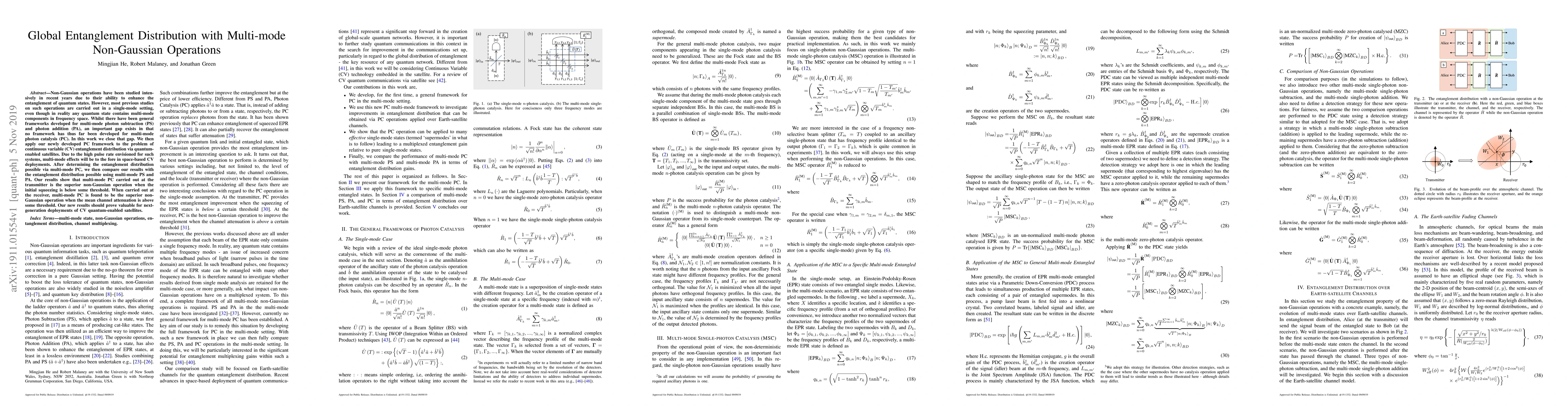 Non-Gaussian operations have been studied intensively in recent years due to their ability to enhance the entanglement of quantum states. However, most previous studies on such operations are carried out in a single-mode setting, even though in reality any quantum state contains multi-mode components in frequency space. Whilst there have been general frameworks developed for multi-mode photon subtraction (PS) and photon addition (PA), an important gap exists in that no framework has thus far been developed for multi-mode photon catalysis (PC). In this work we close that gap. We then apply our newly developed PC framework to the problem of continuous variable (CV) entanglement distribution via quantum-enabled satellites. Due to the high pulse rate envisioned for such systems, multi-mode effects will be to the fore in space-based CV deployments. After determining the entanglement distribution possible via multi-mode PC, we then compare our results with the entanglement distribution possible using multi-mode PS and PA. Our results show that multi-mode PC carried out at the transmitter is the superior non-Gaussian operation when the initial squeezing is below some threshold. When carried out at the receiver, multi-mode PC is found to be the superior non-Gaussian operation when the mean channel attenuation is above some threshold. Our new results should prove valuable for next-generation deployments of CV quantum-enabled satellites.