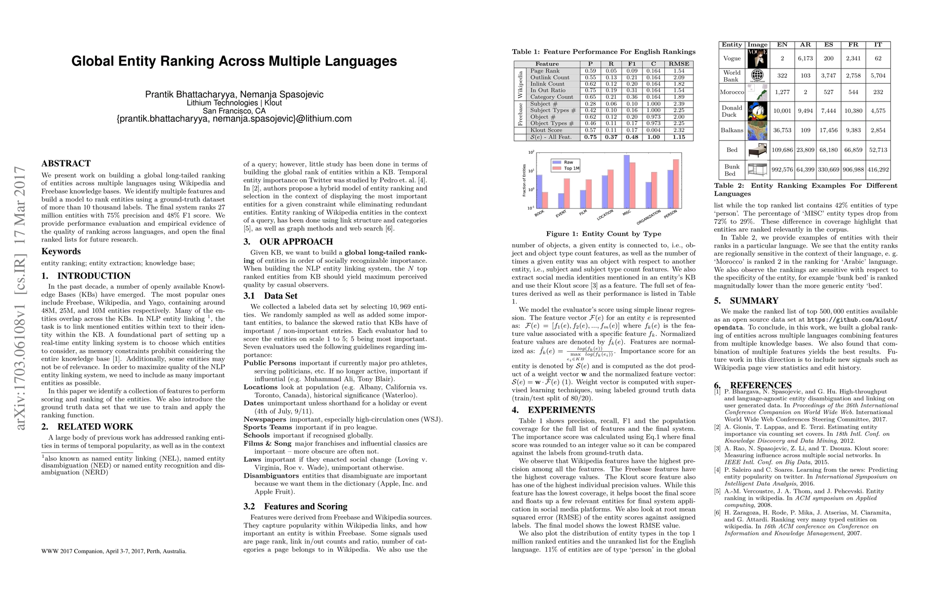 This paper develops a global ranking system for entities across multiple languages using Wikipedia and Freebase, achieving 75% precision and 48% F1 score on a dataset of over 10,000 labels. The system ranks 27 million entities and offers performance evaluation and open-access ranked lists for future research.