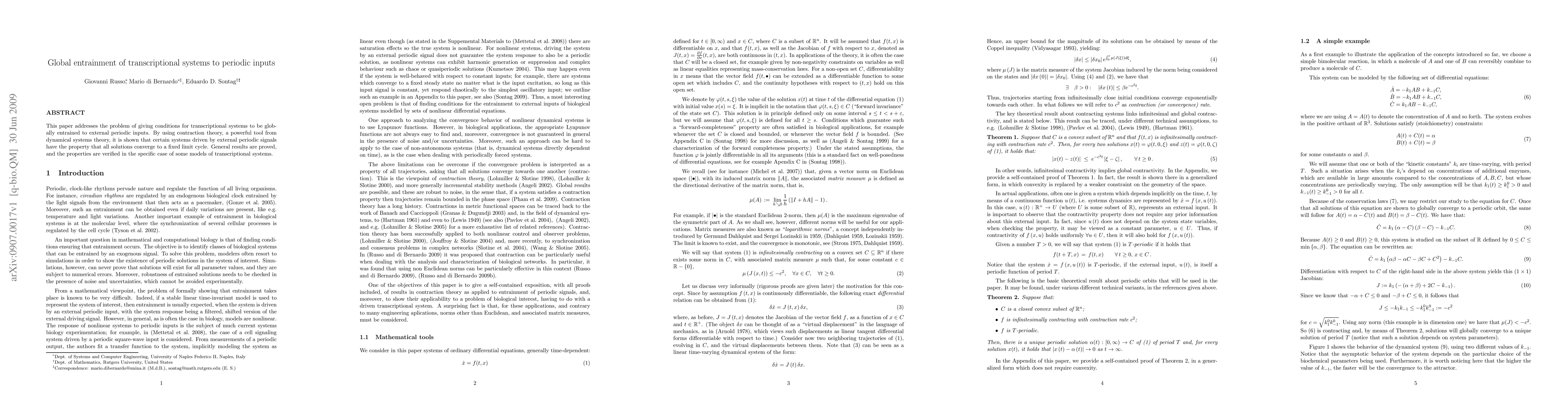 This paper addresses the problem of giving conditions for transcriptional systems to be globally entrained to external periodic inputs. By using contraction theory, a powerful tool from dynamical systems theory, it is shown that certain systems driven by external periodic signals have the property that all solutions converge to a fixed limit cycle. General results are proved, and the properties are verified in the specific case of some models of transcriptional systems. The basic mathematical results needed from contraction theory are proved in the paper, making it self-contained.