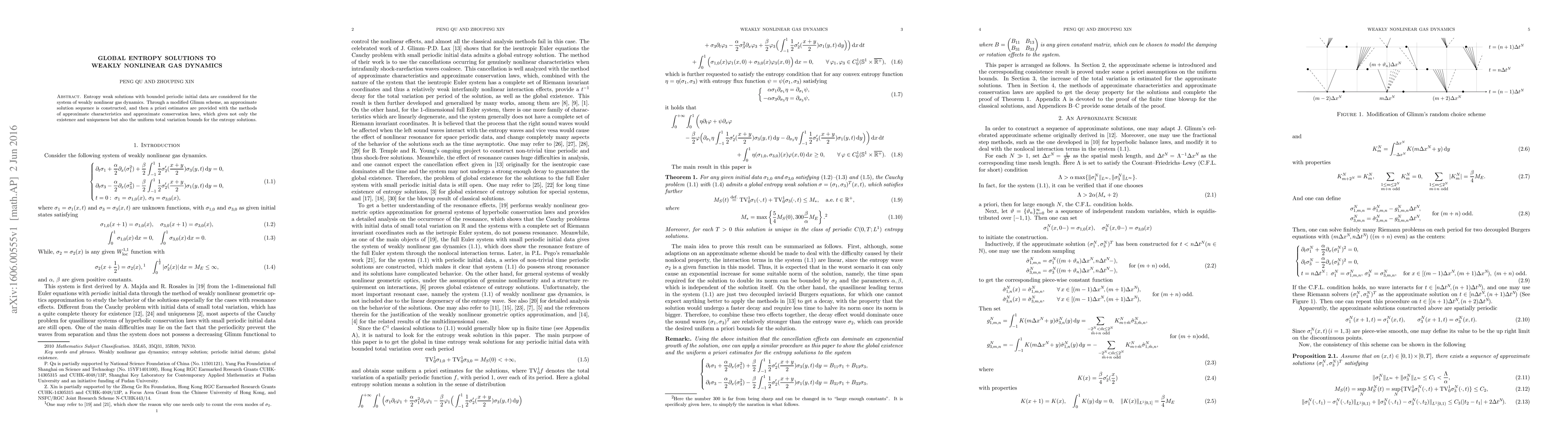 Research proves the existence and uniqueness of entropy solutions to weakly nonlinear gas dynamics with uniform total variation bounds, using a modified Glimm scheme and approximate conservation laws.