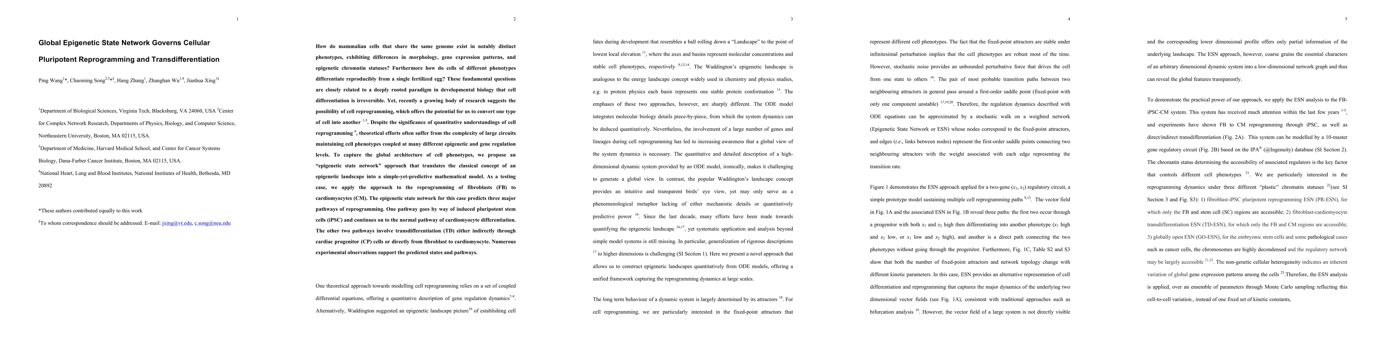 How do mammalian cells that share the same genome exist in notably distinct phenotypes, exhibiting differences in morphology, gene expression patterns, and epigenetic chromatin statuses? Furthermore how do cells of different phenotypes differentiate reproducibly from a single fertilized egg? These fundamental questions are closely related to a deeply rooted paradigm in developmental biology that cell differentiation is irreversible. Yet, recently a growing body of research suggests the possibility of cell reprogramming, which offers the potential for us to convert one type of cell into another. Despite the significance of quantitative understandings of cell reprogramming, theoretical efforts often suffer from the complexity of large circuits maintaining cell phenotypes coupled at many different epigenetic and gene regulation levels. To capture the global architecture of cell phenotypes, we propose an "epigenetic state network" approach that translates the classical concept of an epigenetic landscape into a simple-yet-predictive mathematical model. As a testing case, we apply the approach to the reprogramming of fibroblasts (FB) to cardiomyocytes (CM). The epigenetic state network for this case predicts three major pathways of reprogramming. One pathway goes by way of induced pluripotent stem cells (iPSC) and continues on to the normal pathway of cardiomyocyte differentiation. The other two pathways involve transdifferentiation (TD) either indirectly through cardiac progenitor (CP) cells or directly from fibroblast to cardiomyocyte. Numerous experimental observations support the predicted states and pathways.