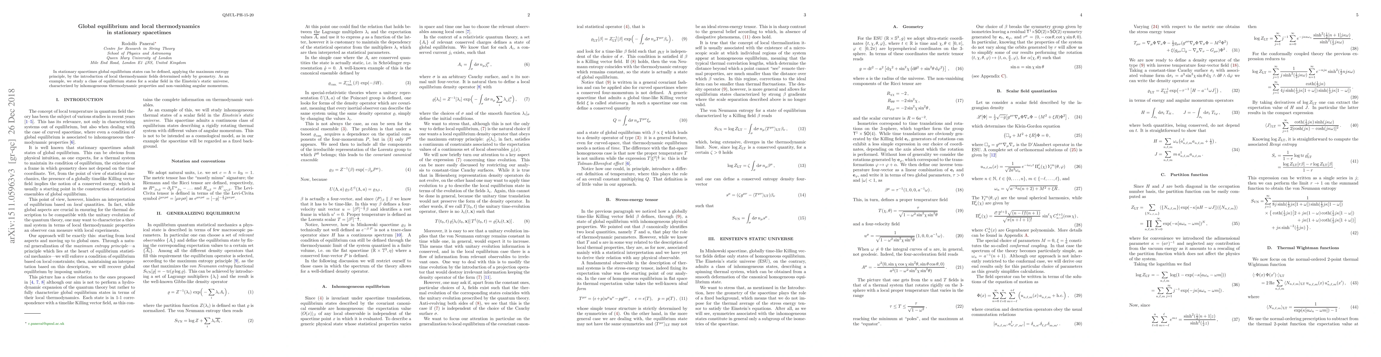 Research introduces a new way to define global equilibrium states in stationary spacetimes using local thermodynamic fields, applicable to specific scenarios like Einstein's static universe. This allows for the study of inhomogeneous thermodynamic properties and non-vanishing angular momentum.