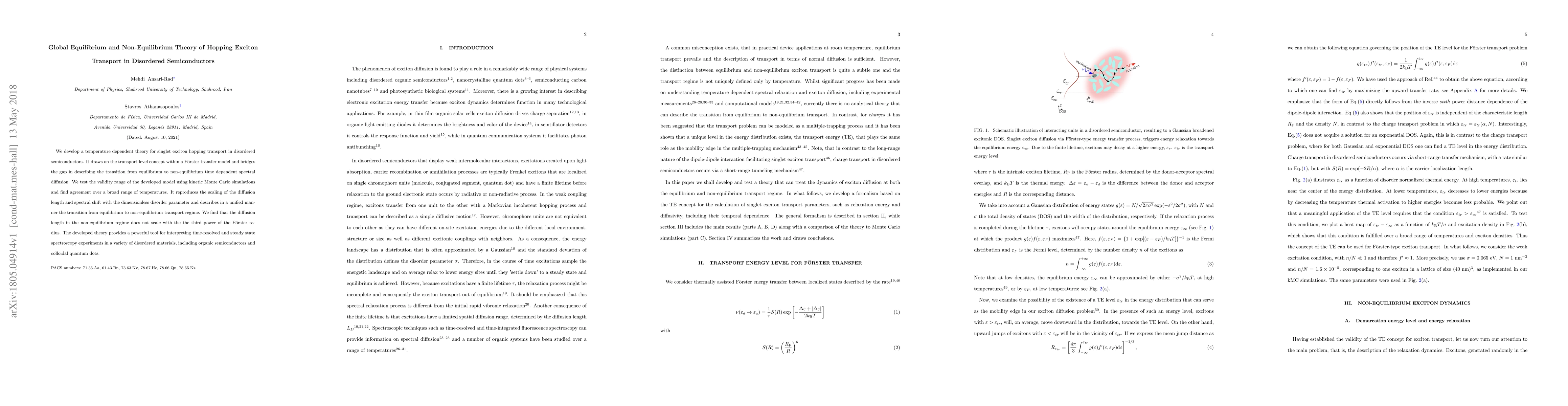 This paper presents a temperature-dependent theory for exciton hopping transport in disordered semiconductors, bridging equilibrium and non-equilibrium transport through a F\"orster transfer model. Kinetic Monte Carlo simulations validate the model's range, showing it accurately describes spectral diffusion and the transition between transport regimes.