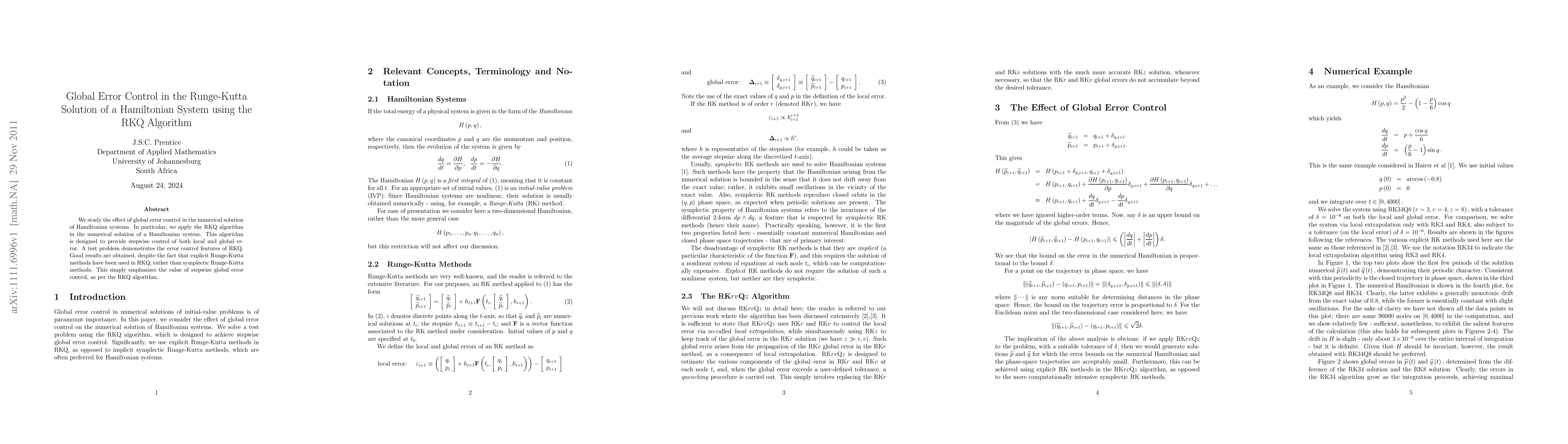 We study the effect of global error control in the numerical solution of Hamiltonian systems. In particular, we apply the RKQ algorithm in the numerical solution of a Hamiltonian system. This algorithm is designed to provide stepwise control of both local and global error. A test problem demonstrates the error control features of RKQ. Good results are obtained, despite the fact that explicit Runge-Kutta methods have been used in RKQ, rather than symplectic Runge-Kutta methods. This simply emphasizes the value of stepwise global error control, as per the RKQ algorithm.