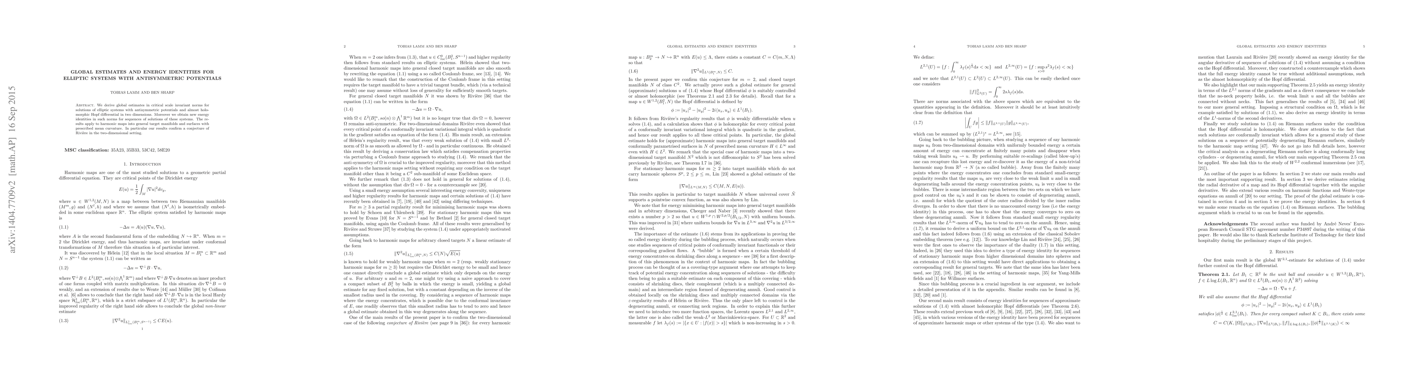 We derive global estimates in critical scale invariant norms for solutions of elliptic systems with antisymmetric potentials and almost holomorphic Hopf differential in two dimensions. Moreover we obtain new energy identities in such norms for sequences of solutions of these systems. The results apply to harmonic maps into general target manifolds and surfaces with prescribed mean curvature. In particular our results confirm a conjecture of Rivi\`ere in the two-dimensional setting.