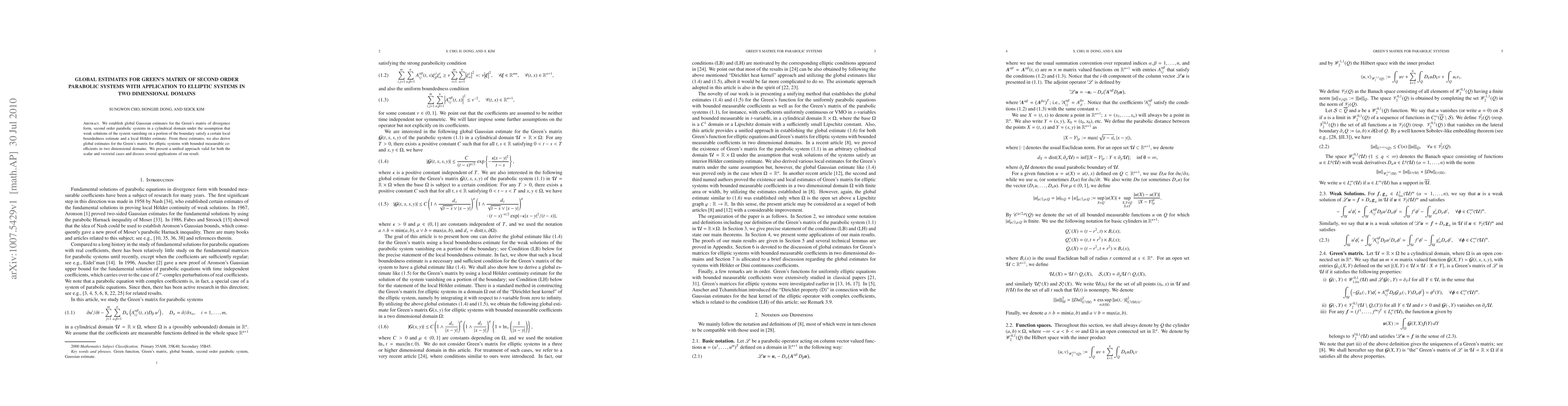 The paper provides global Gaussian estimates for the Green's matrix of second-order parabolic systems in two-dimensional domains, with applications to elliptic systems.
