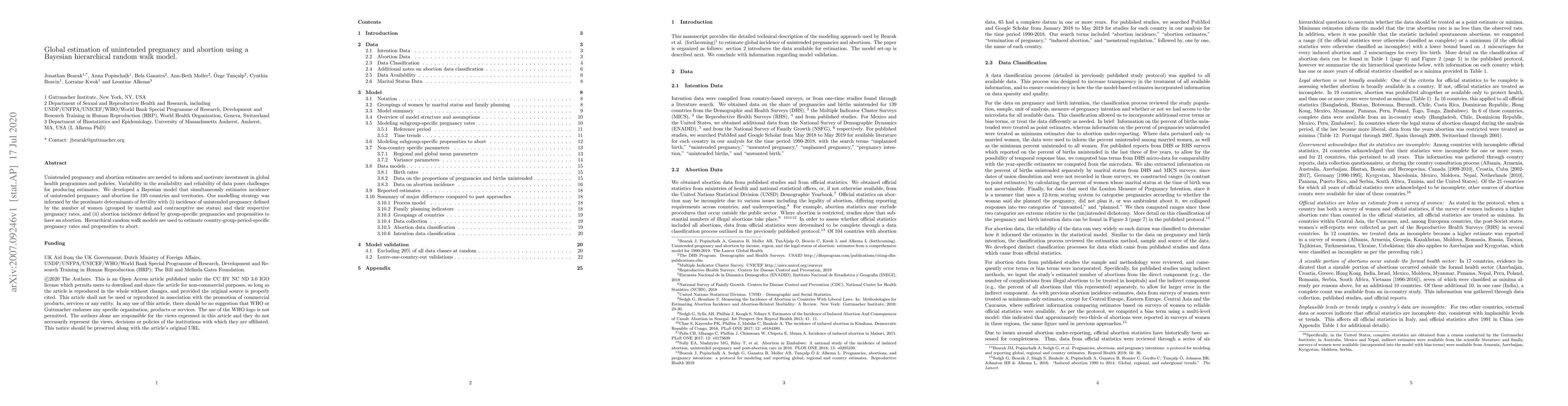 This paper develops a Bayesian hierarchical random walk model to estimate the incidence of unintended pregnancies and abortions across 195 countries, addressing data variability challenges. The model uses proximate determinants of fertility to define and estimate these incidences, providing crucial data for global health policy.