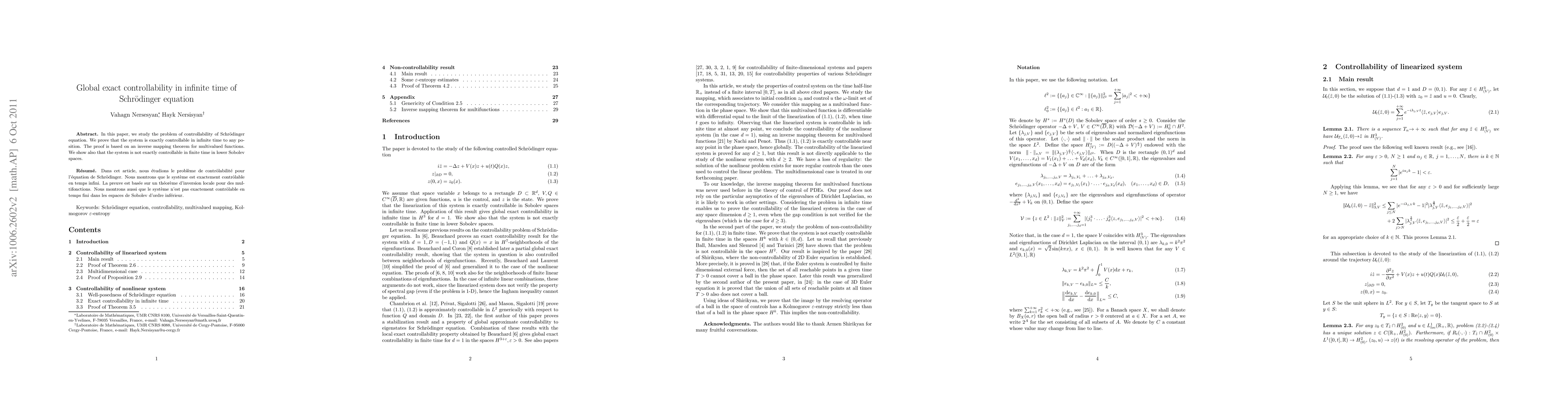 This paper proves that the Schrödinger equation is exactly controllable in infinite time to any position, while it's not in finite time. It uses an inverse mapping theorem for multivalued functions to demonstrate this property.