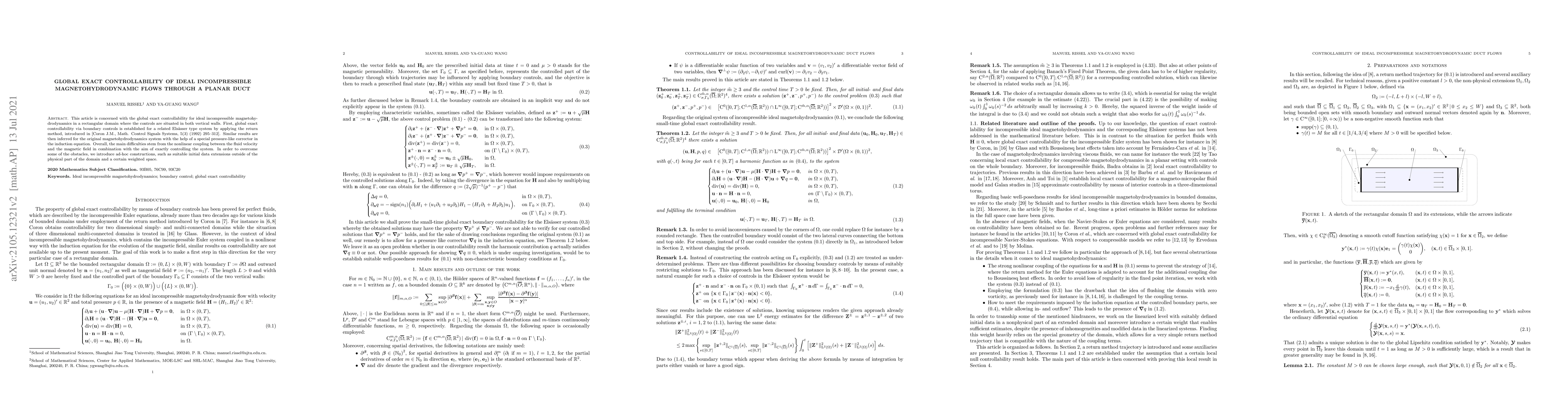 This paper establishes global exact controllability for ideal incompressible magnetohydrodynamics in a rectangular duct using boundary controls on vertical walls. It leverages the return method for an Elsässer type system and a special pressure-like corrector to achieve controllability for the original system, overcoming nonlinear coupling challenges through ad-hoc constructions.