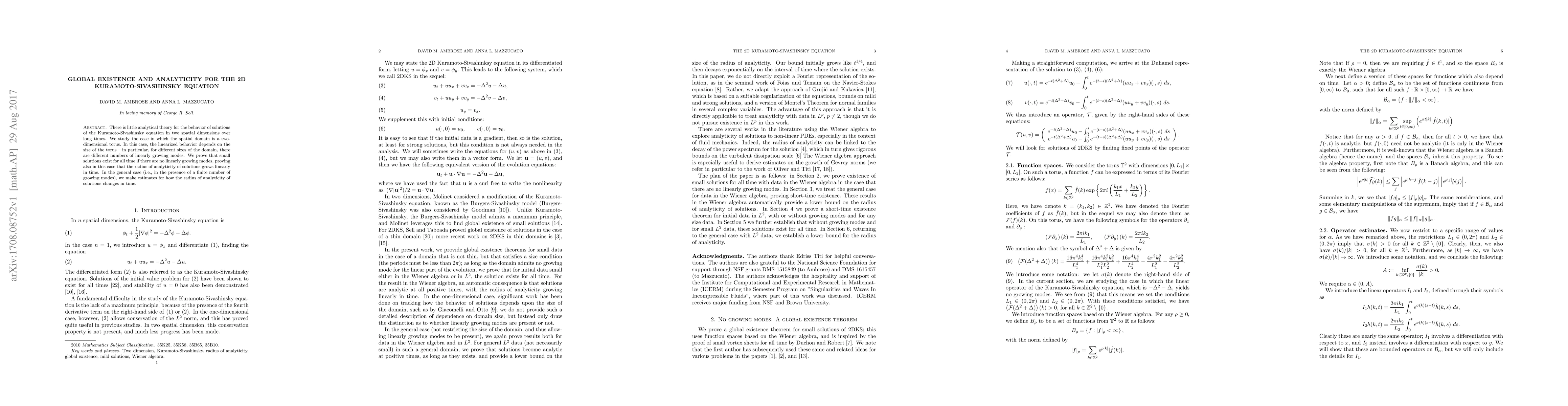 There is little analytical theory for the behavior of solutions of the Kuramoto-Sivashinsky equation in two spatial dimensions over long times. We study the case in which the spatial domain is a two-dimensional torus. In this case, the linearized behavior depends on the size of the torus -- in particular, for different sizes of the domain, there are different numbers of linearly growing modes. We prove that small solutions exist for all time if there are no linearly growing modes, proving also in this case that the radius of analyticity of solutions grows linearly in time. In the general case (i.e., in the presence of a finite number of growing modes), we make estimates for how the radius of analyticity of solutions changes in time.