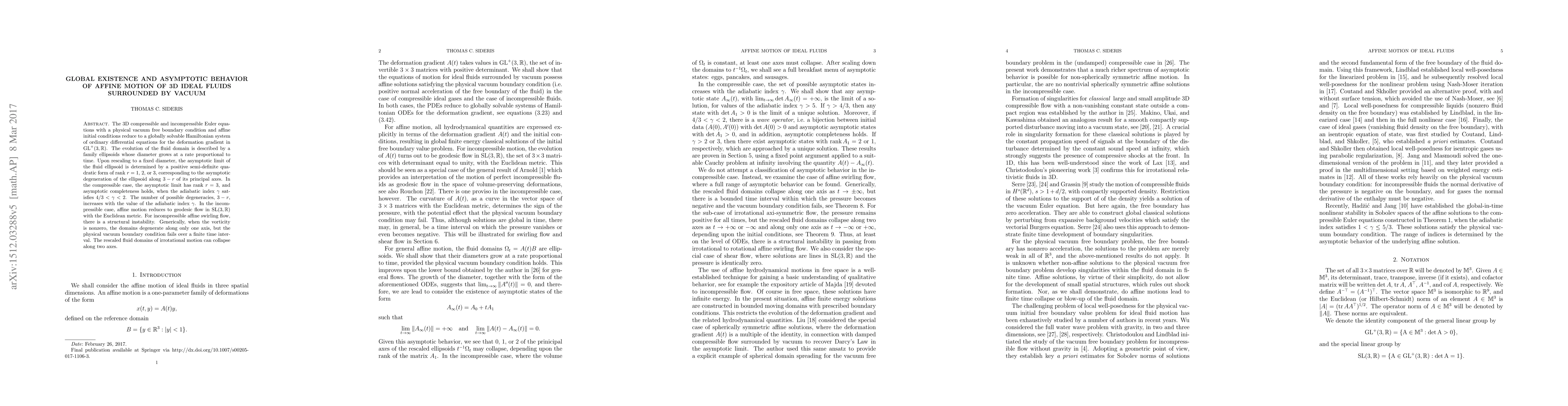 The 3D compressible and incompressible Euler equations with a physical vacuum free boundary condition and affine initial conditions reduce to a globally solvable Hamiltonian system of ordinary differential equations for the deformation gradient in $\rm{GL}^+(3,\mathbb R)$. The evolution of the fluid domain is described by a family ellipsoids whose diameter grows at a rate proportional to time. Upon rescaling to a fixed diameter, the asymptotic limit of the fluid ellipsoid is determined by a positive semi-definite quadratic form of rank $r=1$, 2, or 3, corresponding to the asymptotic degeneration of the ellipsoid along $3-r$ of its principal axes. In the compressible case, the asymptotic limit has rank $r=3$, and asymptotic completeness holds, when the adiabatic index $\gamma$ satisfies $4/3<\gamma<2$. The number of possible degeneracies, $3-r$, increases with the value of the adiabatic index $\gamma$. In the incompressible case, affine motion reduces to geodesic flow in $\rm{SL}(3,\mathbb R)$ with the Euclidean metric. For incompressible affine swirling flow, there is a structural instability. Generically, when the vorticity is nonzero, the domains degenerate along only one axis, but the physical vacuum boundary condition fails over a finite time interval. The rescaled fluid domains of irrotational motion can collapse along two axes.