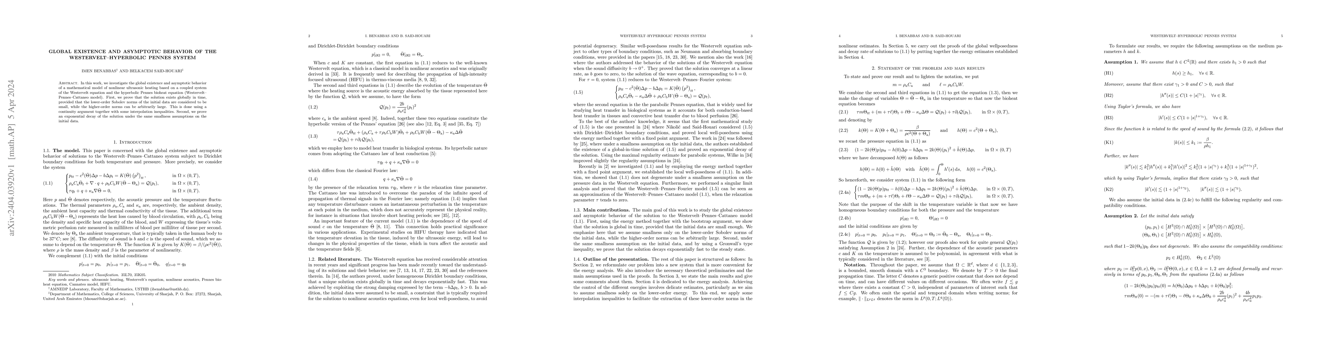 This paper proves global existence of solutions for a coupled nonlinear ultrasonic heating model (Westervelt-Pennes-Cattaneo) under small initial data conditions and demonstrates exponential decay of the solution under these conditions, utilizing continuity arguments and interpolation inequalities.