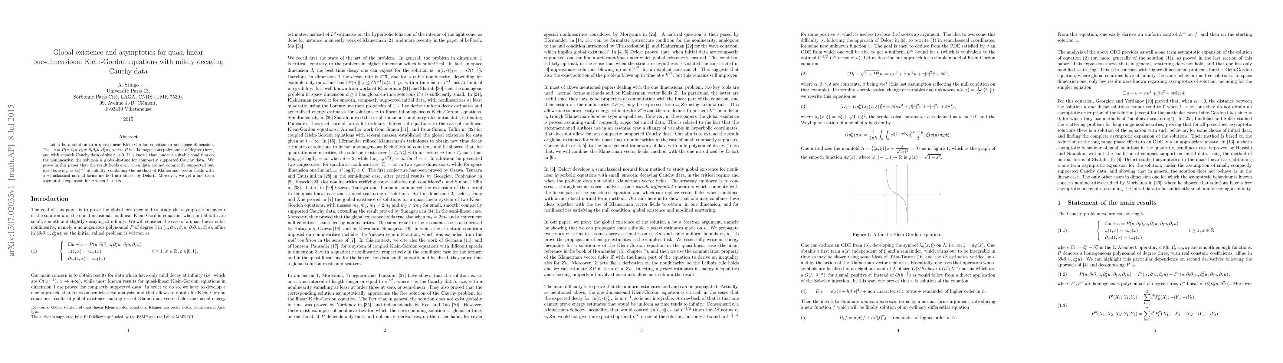 Let u be a solution to a quasi-linear Klein-Gordon equation in one-space dimension, $\Box u + u = P (u, $\partial$\_t u, $\partial$\_x u; $\partial$\_t $\partial$\_x u, $\partial$^2\_x u)$ , where P is a homogeneous polynomial of degree three, and with smooth Cauchy data of size $\epsilon \rightarrow 0$. It is known that, under a suitable condition on the nonlinearity, the solution is global-in-time for compactly supported Cauchy data. We prove in this paper that the result holds even when data are not compactly supported but just decaying as $\langle x \rangle^ {--1}$ at infinity, combining the method of Klainerman vector fields with a semiclassical normal forms method introduced by Delort. Moreover, we get a one term asymptotic expansion for u when $t \rightarrow +\infty$.