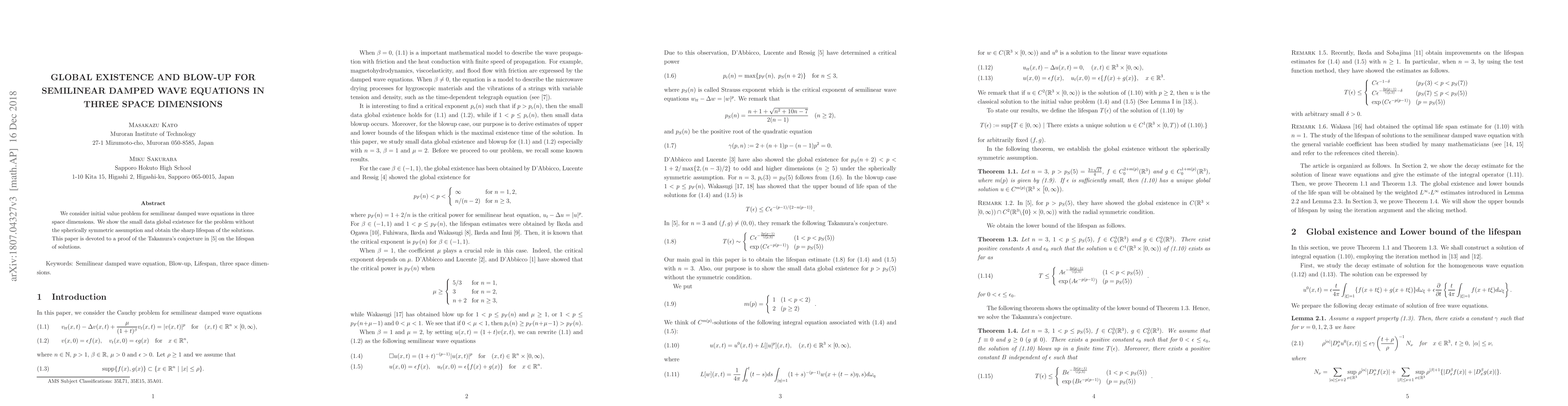 This paper proves small data global existence for semilinear damped wave equations in three dimensions without the spherically symmetric assumption and establishes the sharp lifespan of solutions, confirming Takamura's conjecture on the lifespan of solutions.