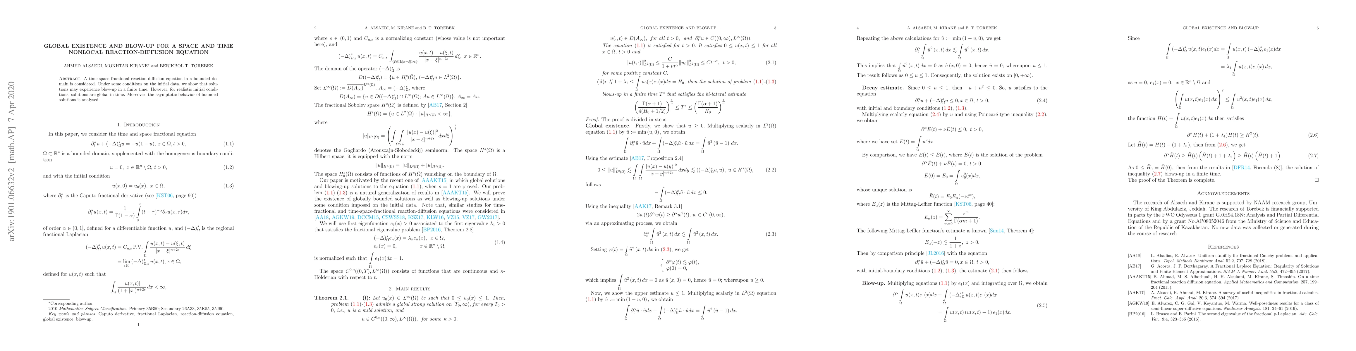 This paper investigates the global existence and blow-up phenomena for a time-space fractional reaction-diffusion equation. It demonstrates that solutions can blow up in finite time under certain initial conditions, while for realistic initial data, solutions exist globally. The study also analyzes the asymptotic behavior of bounded solutions.
