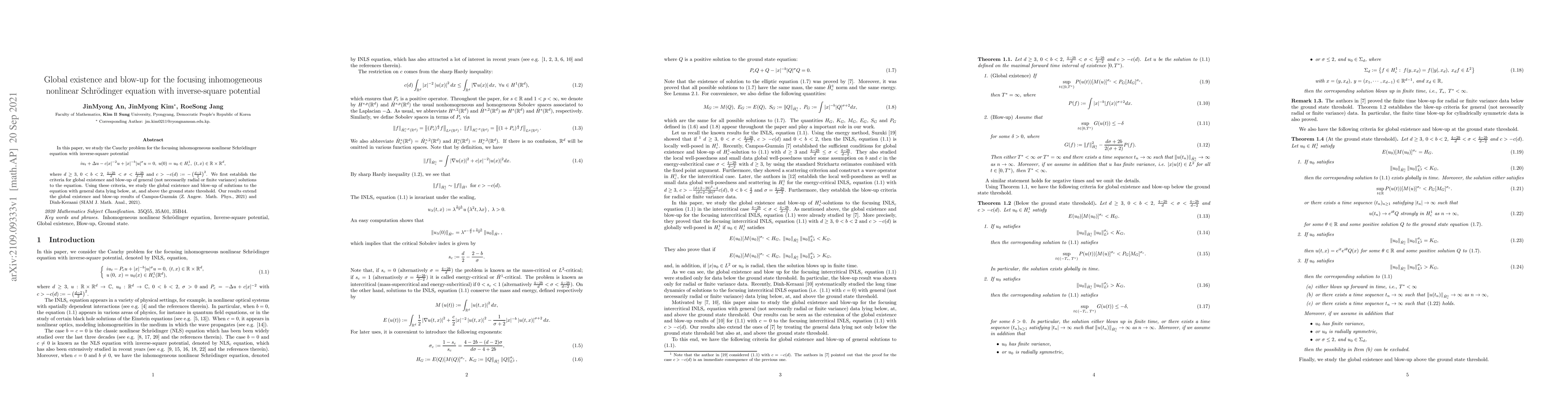 This paper investigates the Cauchy problem for a focusing inhomogeneous nonlinear Schrödinger equation with an inverse-square potential, establishing criteria for global existence and blow-up of solutions. The results extend previous findings and apply to solutions with data below, at, and above the ground state threshold.