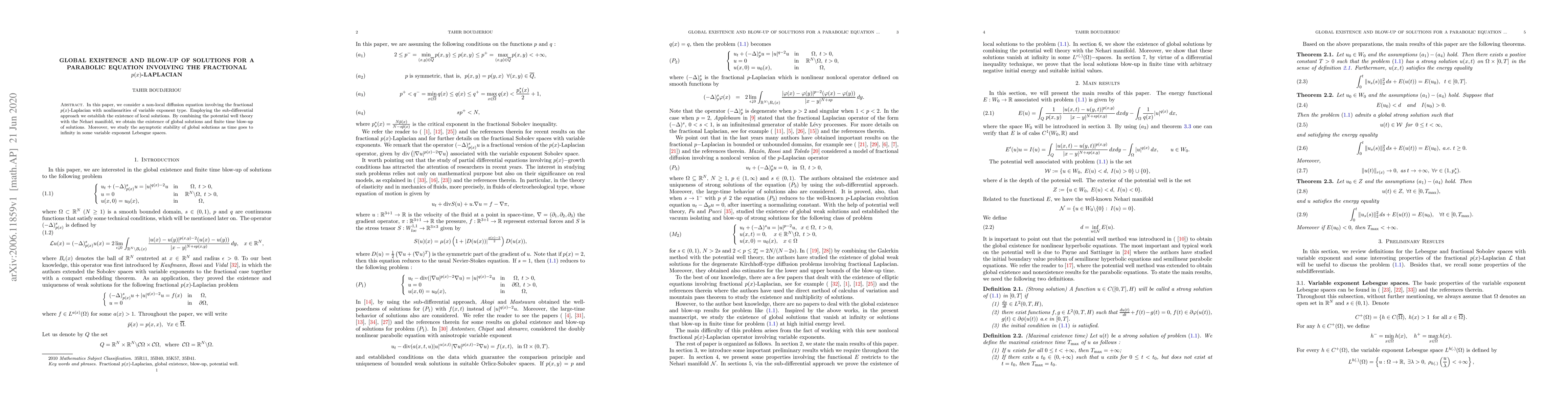 This paper investigates a non-local diffusion equation with a fractional $p(x)$-Laplacian and variable exponent nonlinearities, proving local solution existence via a sub-differential approach. It further establishes global solutions and blow-up conditions through potential well theory and the Nehari manifold, and explores asymptotic stability of global solutions in variable exponent Lebesgue spaces.
