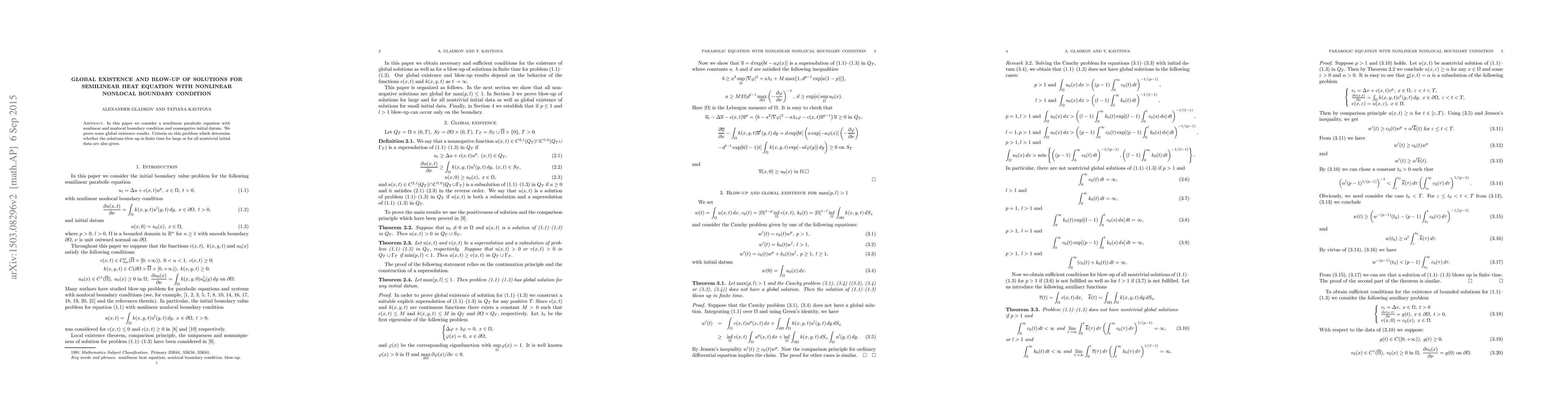 This paper investigates a semilinear heat equation with a nonlinear nonlocal boundary condition. It establishes global existence results and provides criteria determining when solutions will blow up in finite time based on the initial data.
