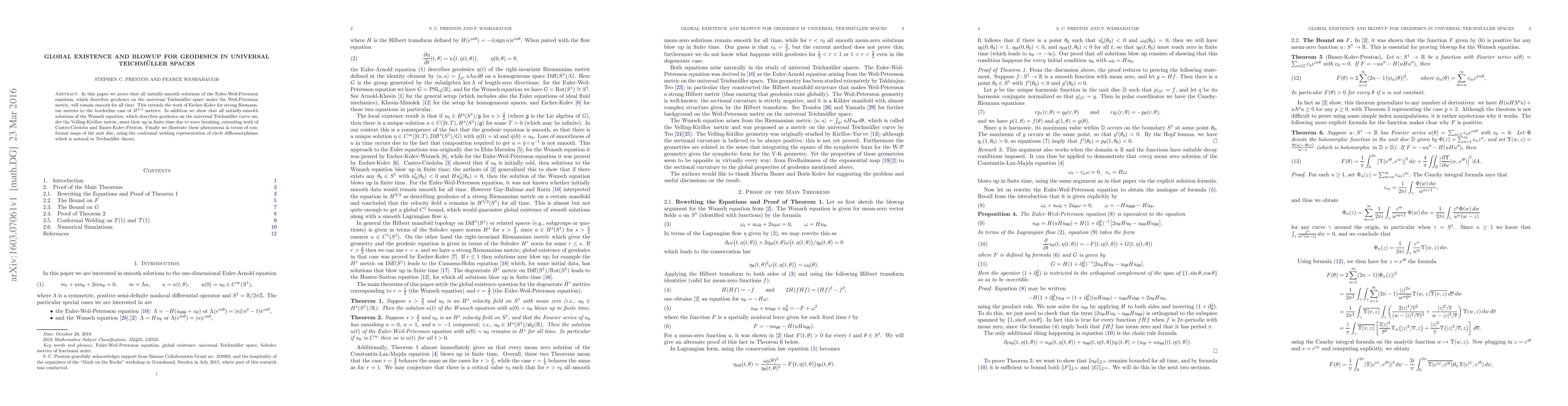 In this paper we prove that all initially-smooth solutions of the Euler-Weil-Petersson equation, which describes geodesics on the universal Teichm\"uller space under the Weil-Petersson metric, will remain smooth for all time. This extends the work of Escher-Kolev for strong Riemannian metrics to the borderline case of $H^{3/2}$ metrics. In addition we show that all initially-smooth solutions of the Wunsch equation, which describes geodesics on the universal Teichm\"uller curve under the Velling-Kirillov metric, must blow up in finite time due to wave breaking, extending work of Castro-C\'ordoba and Bauer-Kolev-Preston. Finally we illustrate these phenomena in terms of conformal maps of the unit disc, using the conformal welding representation of circle diffeomorphisms which is natural in Teichm\"uller theory.