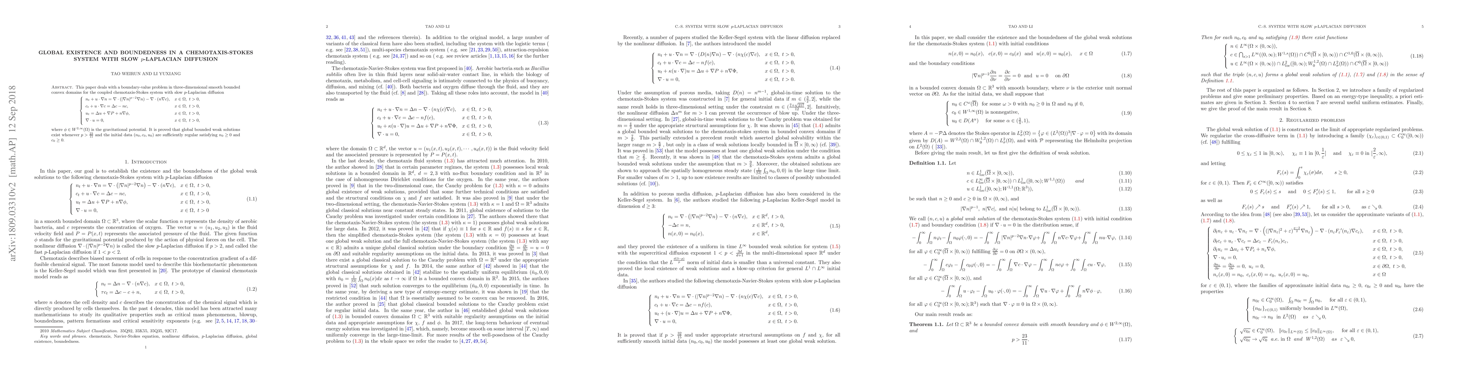 This paper investigates the chemotaxis-Stokes system with slow $p$-Laplacian diffusion in three-dimensional domains, proving global existence and boundedness of weak solutions for $p>\frac{23}{11}$ under regular initial conditions.