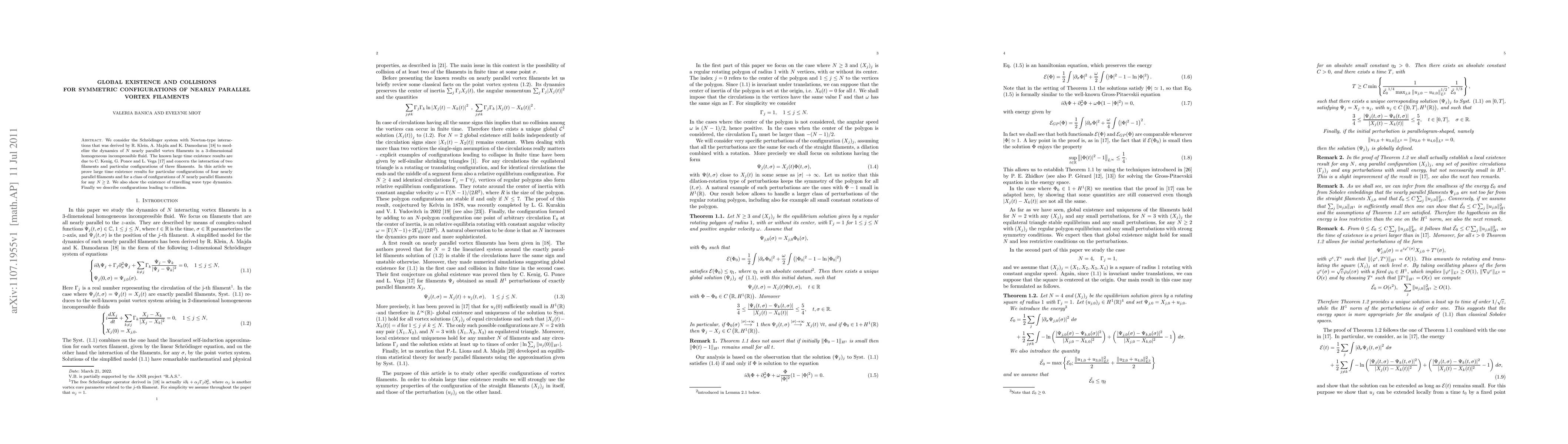 This paper proves the global existence of solutions for the Schrödinger system modeling N nearly parallel vortex filaments, extending results to configurations of four filaments and any N ≥ 2. It also demonstrates the existence of traveling wave dynamics and describes scenarios leading to collisions.
