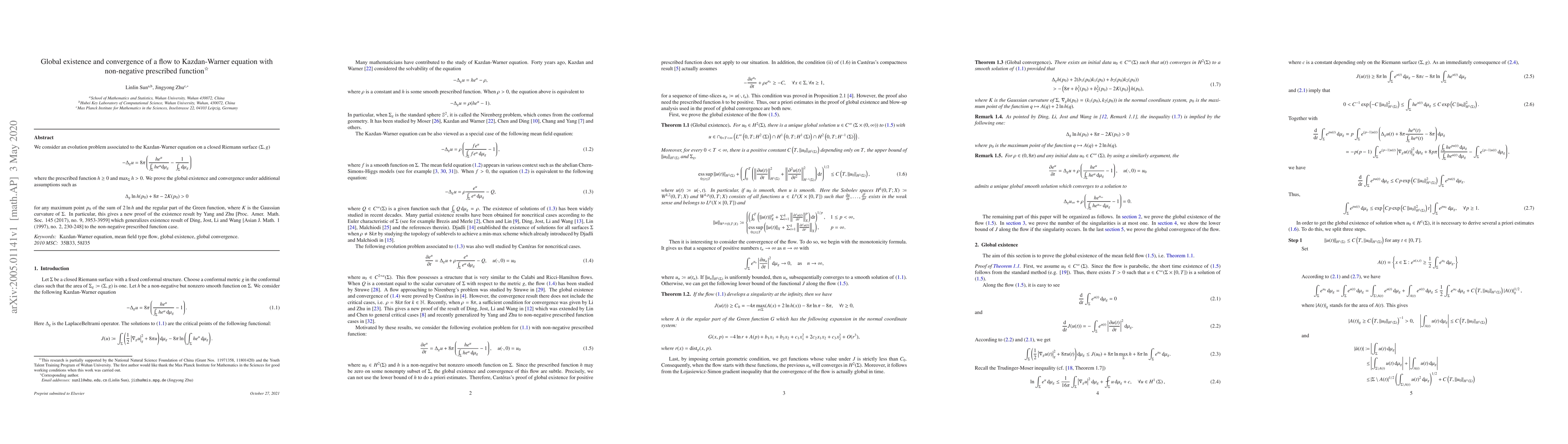 We consider an evolution problem associated to the Kazdan-Warner equation on a closed Riemann surface $(\Sigma,g)$ \begin{align*} -\Delta_{g}u=8\pi\left(\frac{he^{u}}{\int_{\Sigma}he^{u}{\rm d}\mu_{g}}-\frac{1}{\int_{\Sigma}{\rm d}\mu_{g}}\right) \end{align*} where the prescribed function $h\geq0$ and $\max_{\Sigma}h>0$. We prove the global existence and convergence under additional assumptions such as \begin{align*} \Delta_{g}\ln h(p_0)+8\pi-2K(p_0)>0 \end{align*} for any maximum point $p_0$ of the sum of $2\ln h$ and the regular part of the Green function, where $K$ is the Gaussian curvature of $\Sigma$. In particular, this gives a new proof of the existence result by Yang and Zhu [Proc. Amer. Math. Soc. 145 (2017), no. 9, 3953-3959] which generalizes existence result of Ding, Jost, Li and Wang [Asian J. Math. 1 (1997), no. 2, 230-248] to the non-negative prescribed function case.