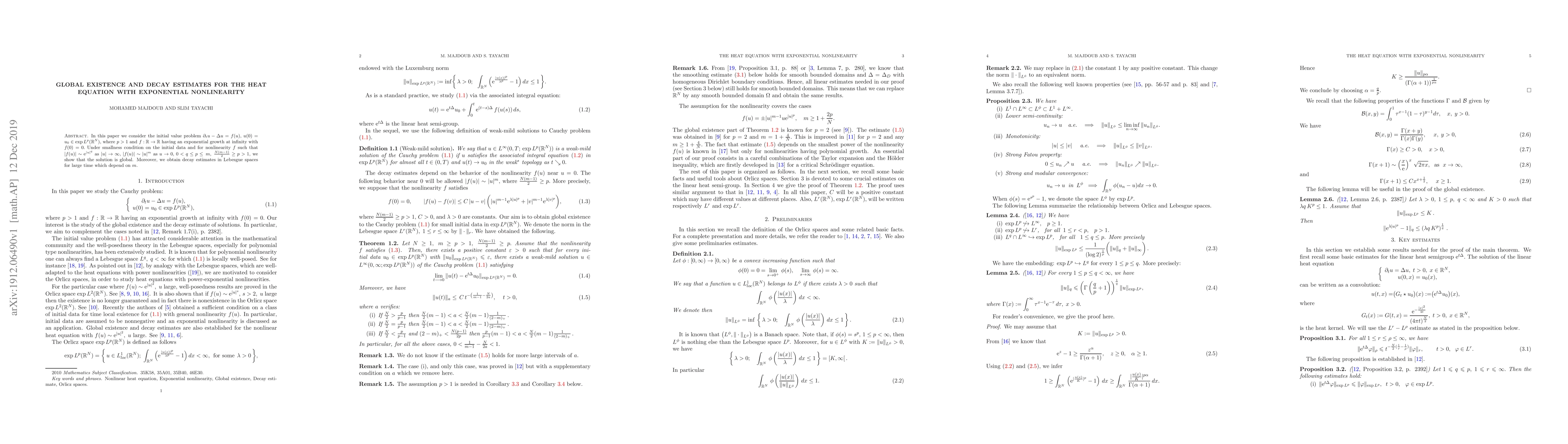 This research establishes global existence and decay estimates for the heat equation with exponential nonlinearity, under specific conditions on initial data and nonlinearity growth. It demonstrates global solutions for small initial data and exponential nonlinearity, providing time-dependent decay estimates in Lebesgue spaces.