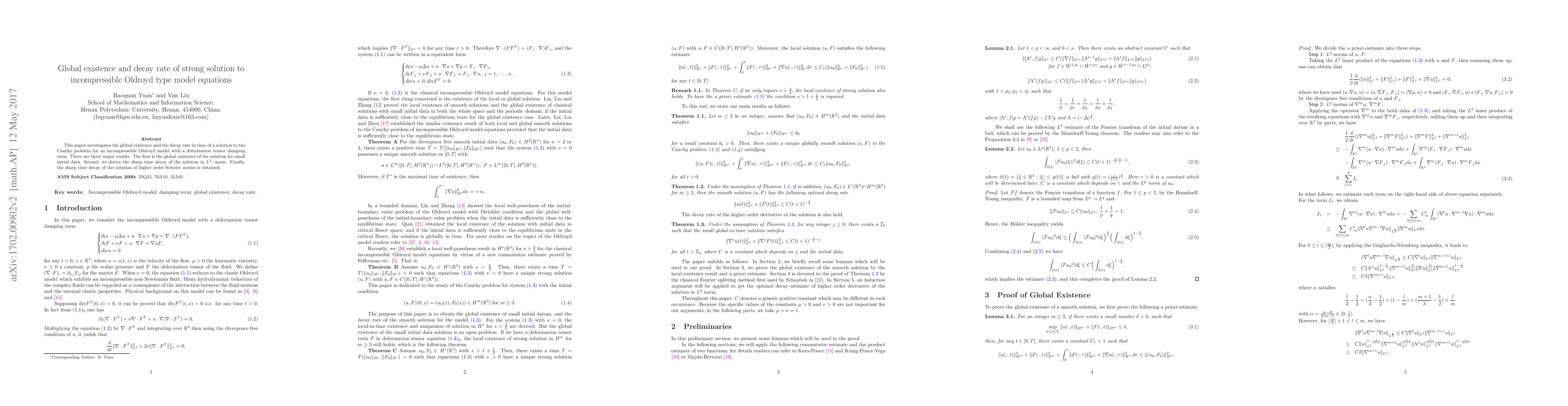This research proves global existence and decay rates for strong solutions to the Cauchy problem of incompressible Oldroyd model equations, including sharp time decay in $L^{2}$-norm and higher order Sobolev norms for small initial data.