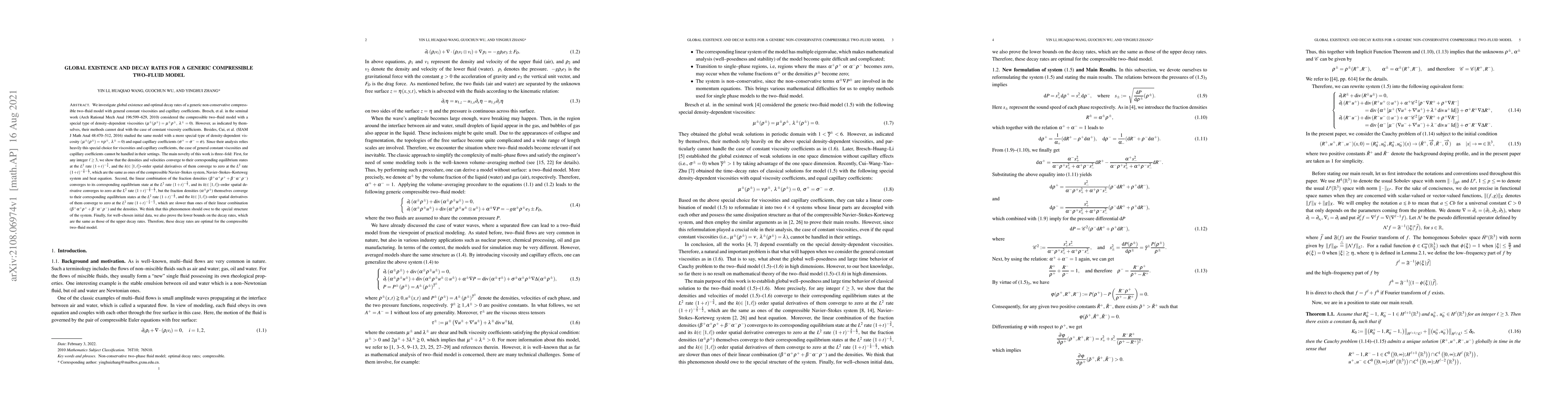 We investigate global existence and optimal decay rates of a generic non-conservative compressible two--fluid model with general constant viscosities and capillary coefficients.The main novelty of this work is three--fold: First, for any integer $\ell\geq3$, we show that the densities and velocities converge to their corresponding equilibrium states at the $L^2$ rate $(1+t)^{-\frac{3}{4}}$, and the $k$($\in [1, \ell]$)--order spatial derivatives of them converge to zero at the $L^2$ rate $(1+t)^{-\frac{3}{4}-\frac{k}{2}}$, which are the same as ones of the compressible Navier--Stokes system, Navier--Stokes--Korteweg system and heat equation. Second, the linear combination of the fraction densities ($\beta^+\alpha^+\rho^++\beta^-\alpha^-\rho^-$) converges to its corresponding equilibrium state at the $L^2$ rate $(1+t)^{-\frac{3}{4}}$, and its $k$($\in [1, \ell]$)--order spatial derivative converges to zero at the $L^2$ rate $(1+t)^{-\frac{3}{4}-\frac{k}{2}}$, but the fraction densities ($\alpha^\pm\rho^\pm$) themselves converge to their corresponding equilibrium states at the $L^2$ rate $(1+t)^{-\frac{1}{4}}$, and the $k$($\in [1, \ell]$)--order spatial derivatives of them converge to zero at the $L^2$ rate $(1+t)^{-\frac{1}{4}-\frac{k}{2}}$, which are slower than ones of their linear combination ($\beta^+\alpha^+\rho^++\beta^-\alpha^-\rho^-$) and the densities. We think that this phenomenon should owe to the special structure of the system. Finally, for well--chosen initial data, we also prove the lower bounds on the decay rates, which are the same as those of the upper decay rates. Therefore, these decay rates are optimal for the compressible two--fluid model.