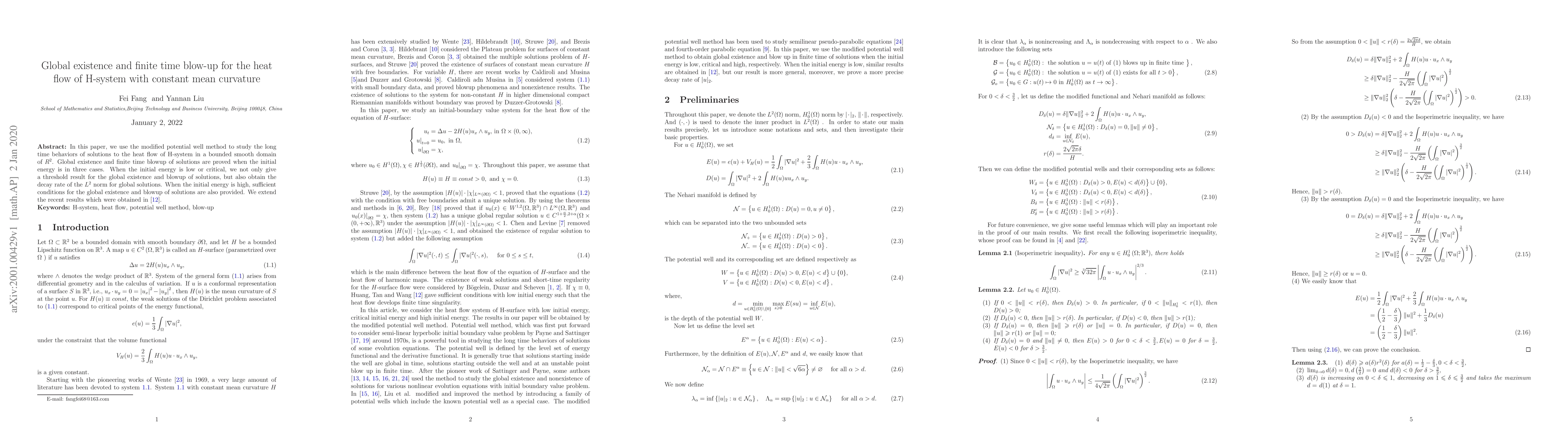 This paper investigates the long-term behavior of solutions to the heat flow of H-system with constant mean curvature, proving global existence and finite time blow-up under different initial energy conditions using the modified potential well method. It provides decay rates for global solutions and extends previous results.