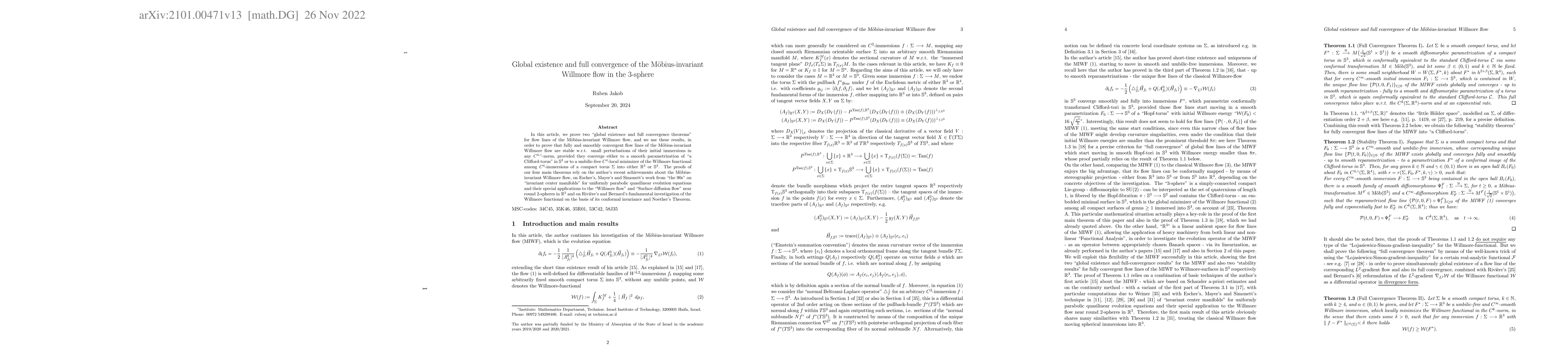 This paper proves global existence and full convergence theorems for M\"obius-invariant Willmore flow in the 3-sphere, demonstrating stability under small perturbations for flow lines converging to Clifford tori or umbilic-free local minimizers. The proofs leverage recent advancements in M\"obius-invariant Willmore flow, prior work on invariant center manifolds, and the conformal invariance of the Willmore functional.
